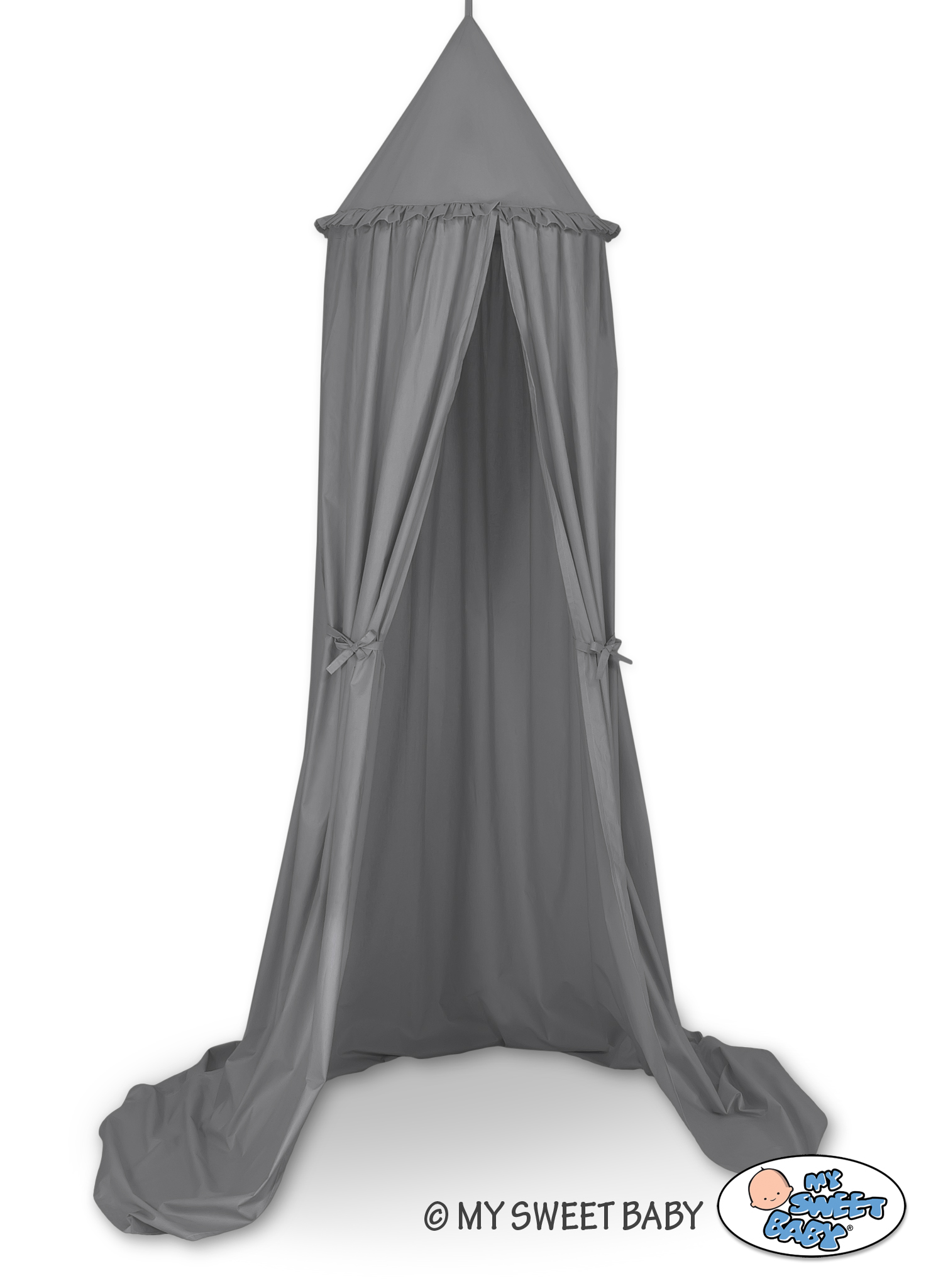 Baldachim wykonany jest z tkaniny 100% bawełnianej, posiadającej atest Okotex. Po bokach znajdują się praktyczne tasiemki, które umożliwiają dowolne upięcie baldachimu. Dzięki wyjmowanej obręczy, łatwo utrzymać go w czystości – można prać w pralce w 30 stopniach.