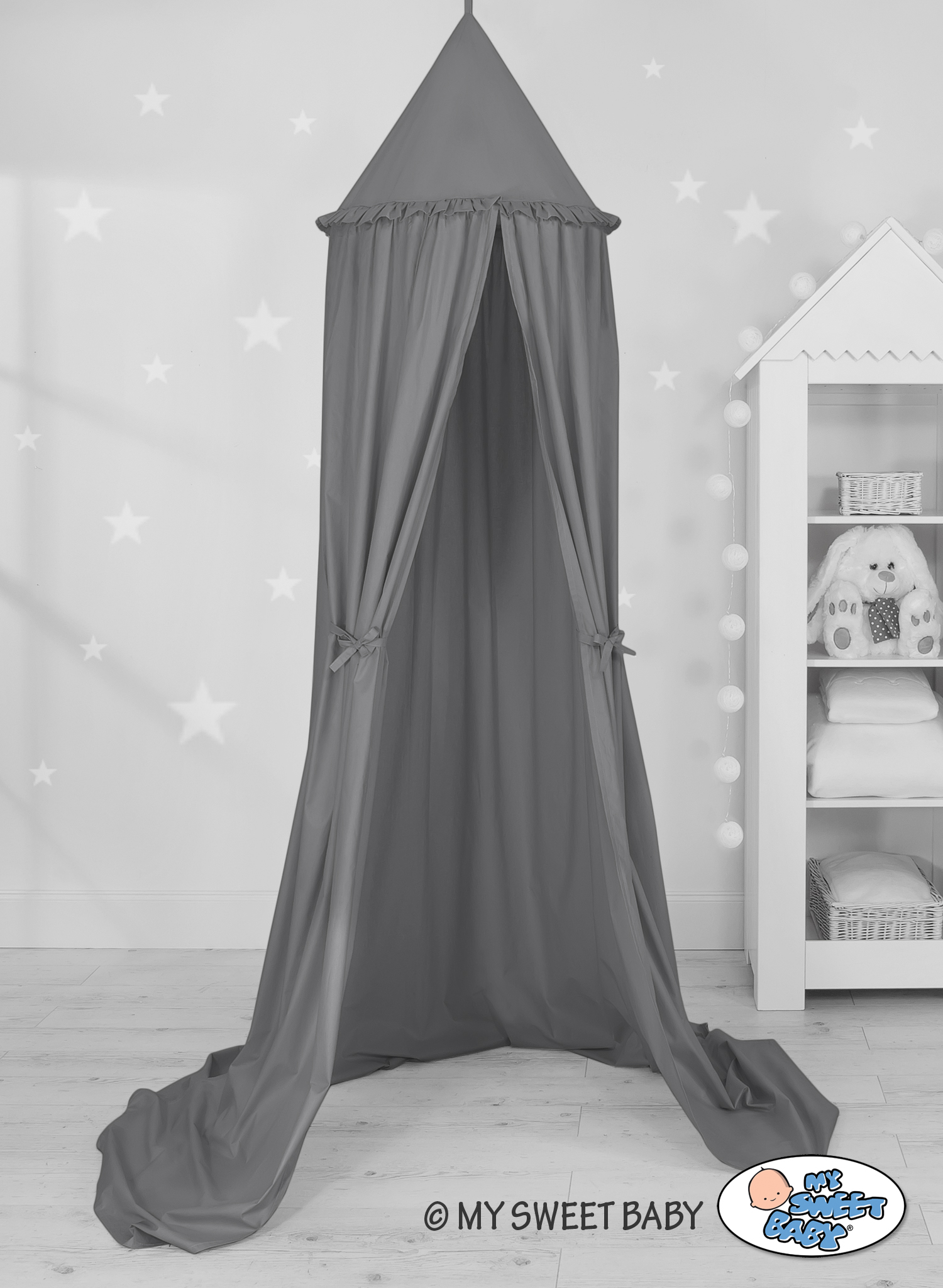 Efektowny wiszący baldachim, piękny element pokoju dziecięcego. Może służyć jako niepowtarzalna dekoracja łóżeczka dziecięcego. Jak również może stworzyć przytulne miejsce do zabawy. Zawieszony nad łóżeczkiem dziecięcym osłoni przed nadmiarem światła oraz wytłumi hałasy, tworząc wewnątrz łóżeczka przytulne i bezpieczne miejsce do odpoczynku. Baldachim można łatwo zamontować do sufitu. Jest długi ok. 260cm, dzięki czemu swobodnie ułoży się na ziemi, tworząc doskonałą kryjówkę i miejsce do zabawy.