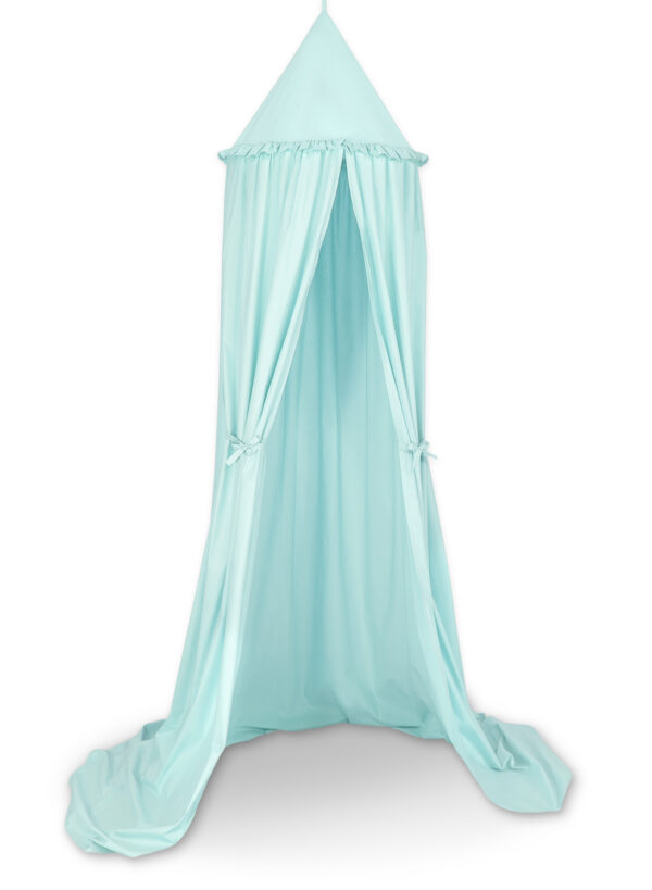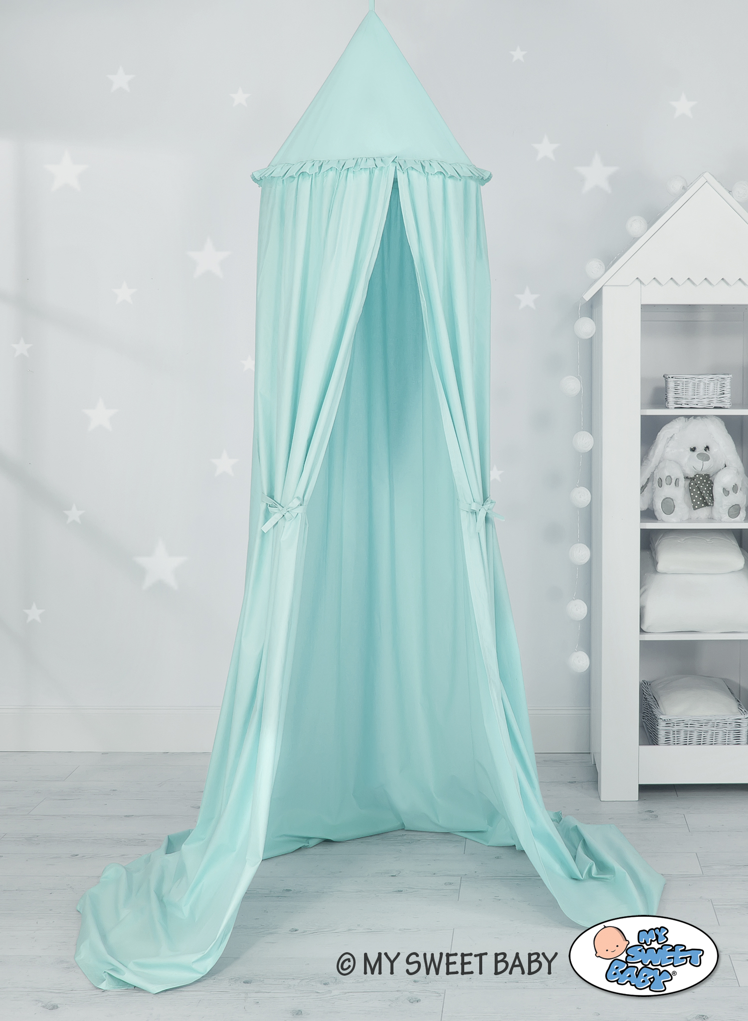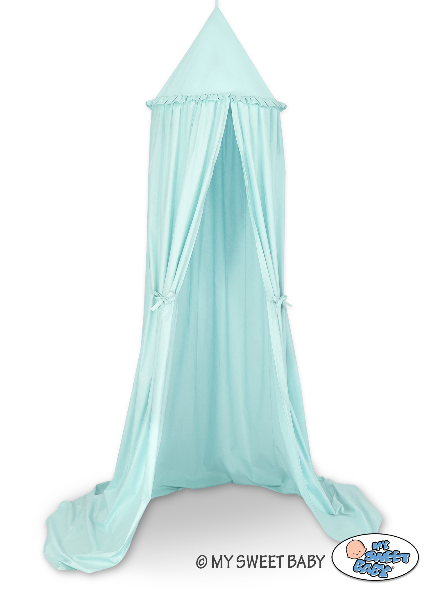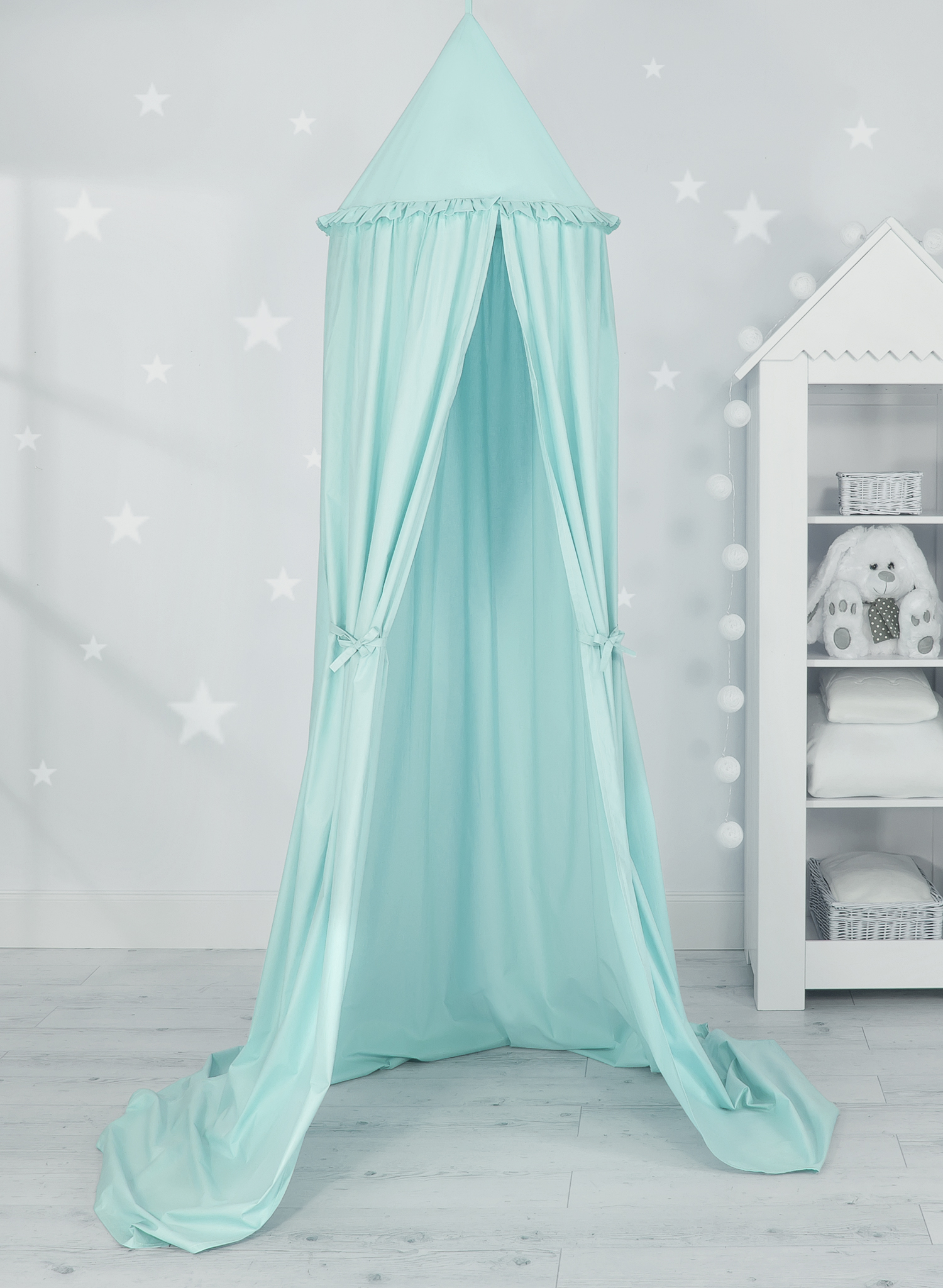 Efektowny wiszący baldachim, piękny element pokoju dziecięcego. Może służyć jako niepowtarzalna dekoracja łóżeczka dziecięcego. Jak również może stworzyć przytulne miejsce do zabawy. Zawieszony nad łóżeczkiem dziecięcym osłoni przed nadmiarem światła oraz wytłumi hałasy, tworząc wewnątrz łóżeczka przytulne i bezpieczne miejsce do odpoczynku. Baldachim można łatwo zamontować do sufitu. Jest długi ok. 260cm, dzięki czemu swobodnie ułoży się na ziemi, tworząc doskonałą kryjówkę i miejsce do zabawy.