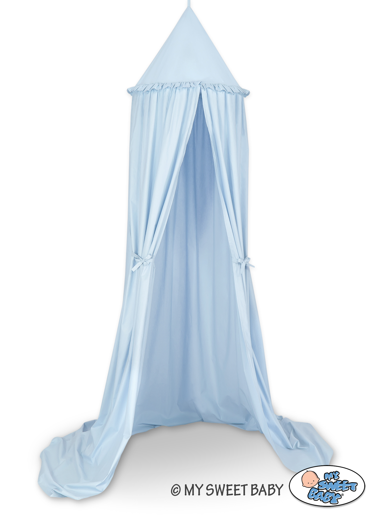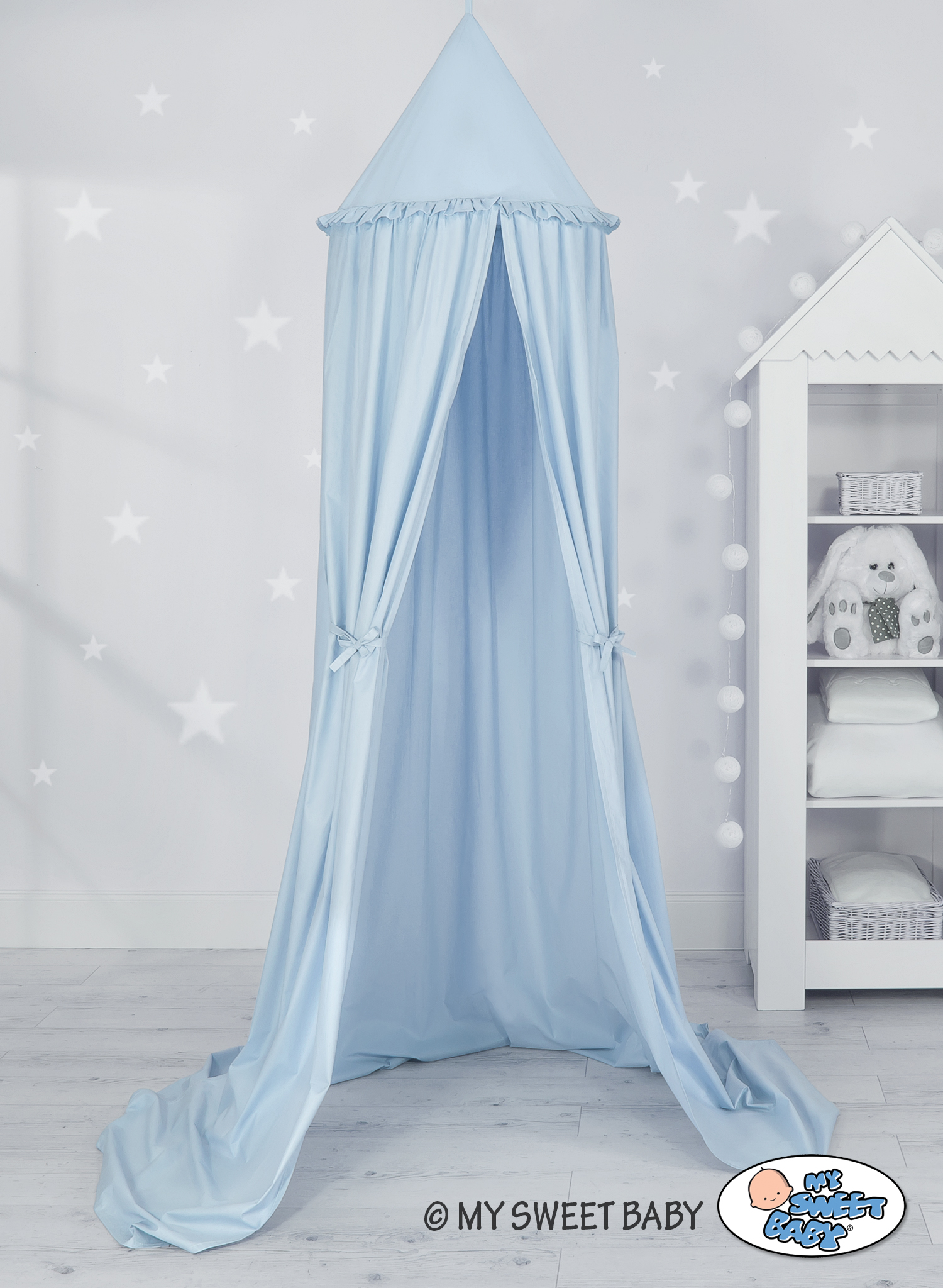 Efektowny wiszący baldachim, piękny element pokoju dziecięcego. Może służyć jako niepowtarzalna dekoracja łóżeczka dziecięcego. Jak również może stworzyć przytulne miejsce do zabawy. Zawieszony nad łóżeczkiem dziecięcym osłoni przed nadmiarem światła oraz wytłumi hałasy, tworząc wewnątrz łóżeczka przytulne i bezpieczne miejsce do odpoczynku. Baldachim można łatwo zamontować do sufitu. Jest długi ok. 260cm, dzięki czemu swobodnie ułoży się na ziemi, tworząc doskonałą kryjówkę i miejsce do zabawy.