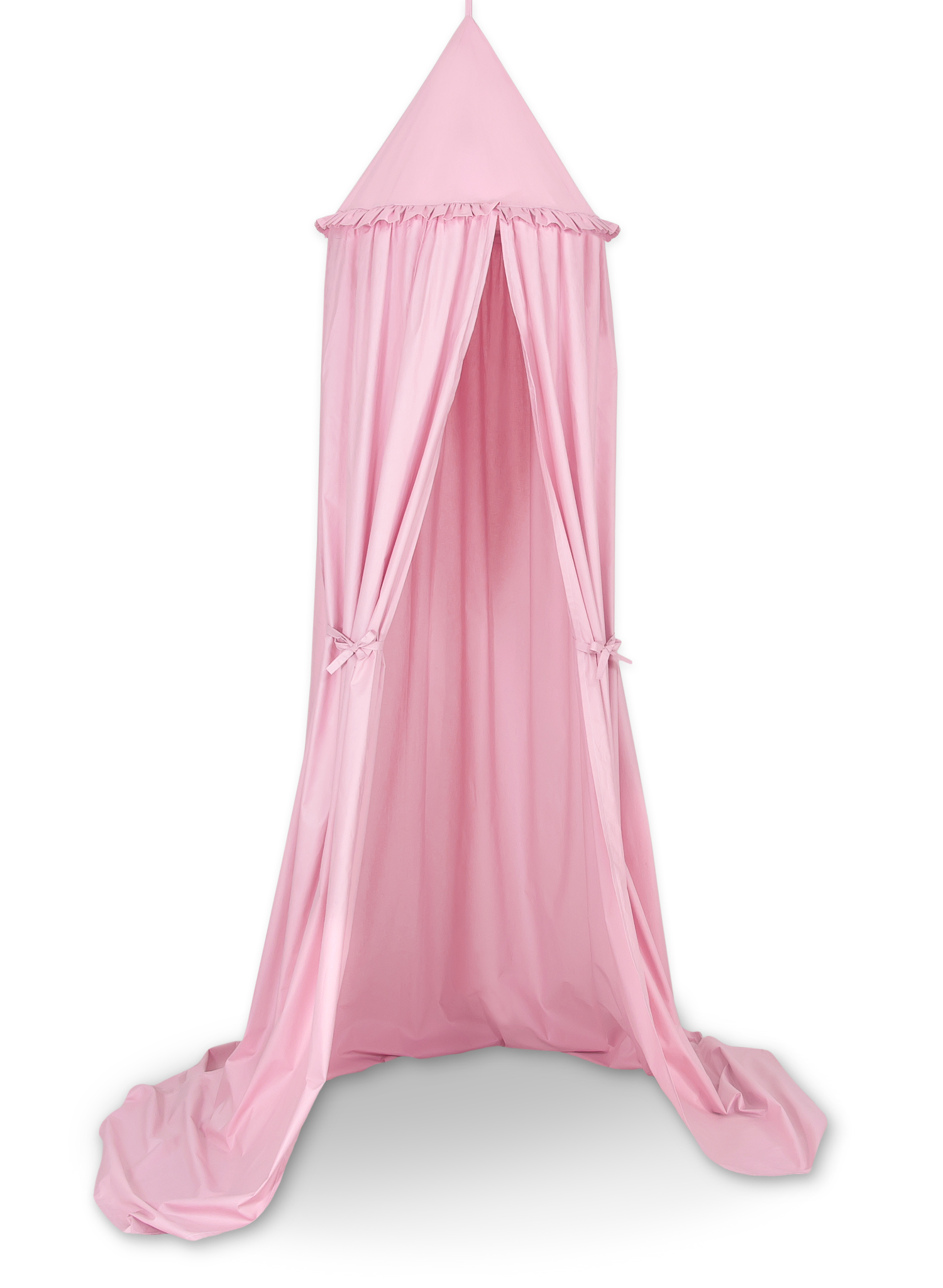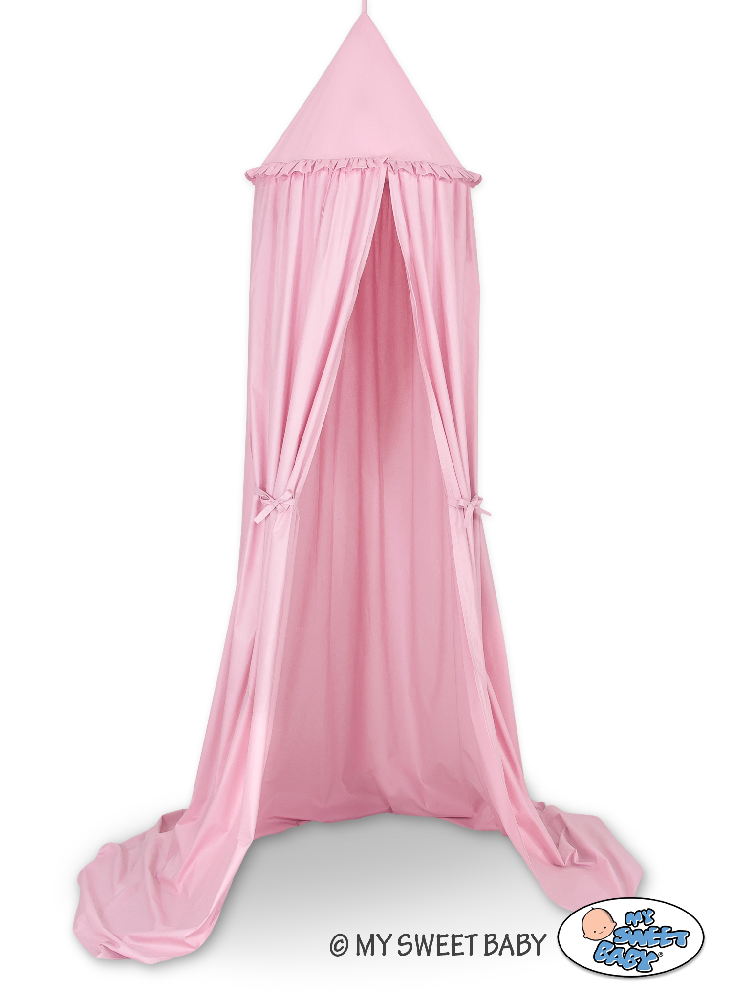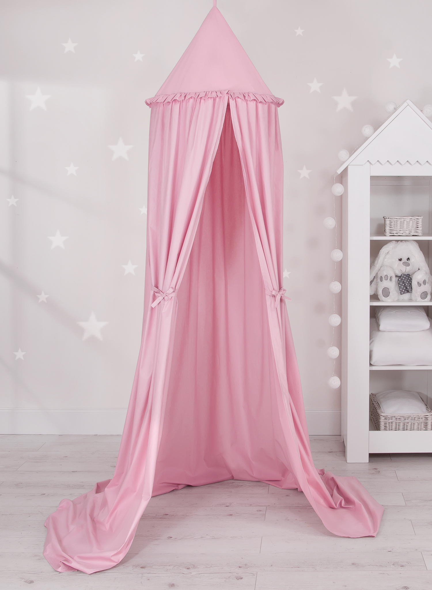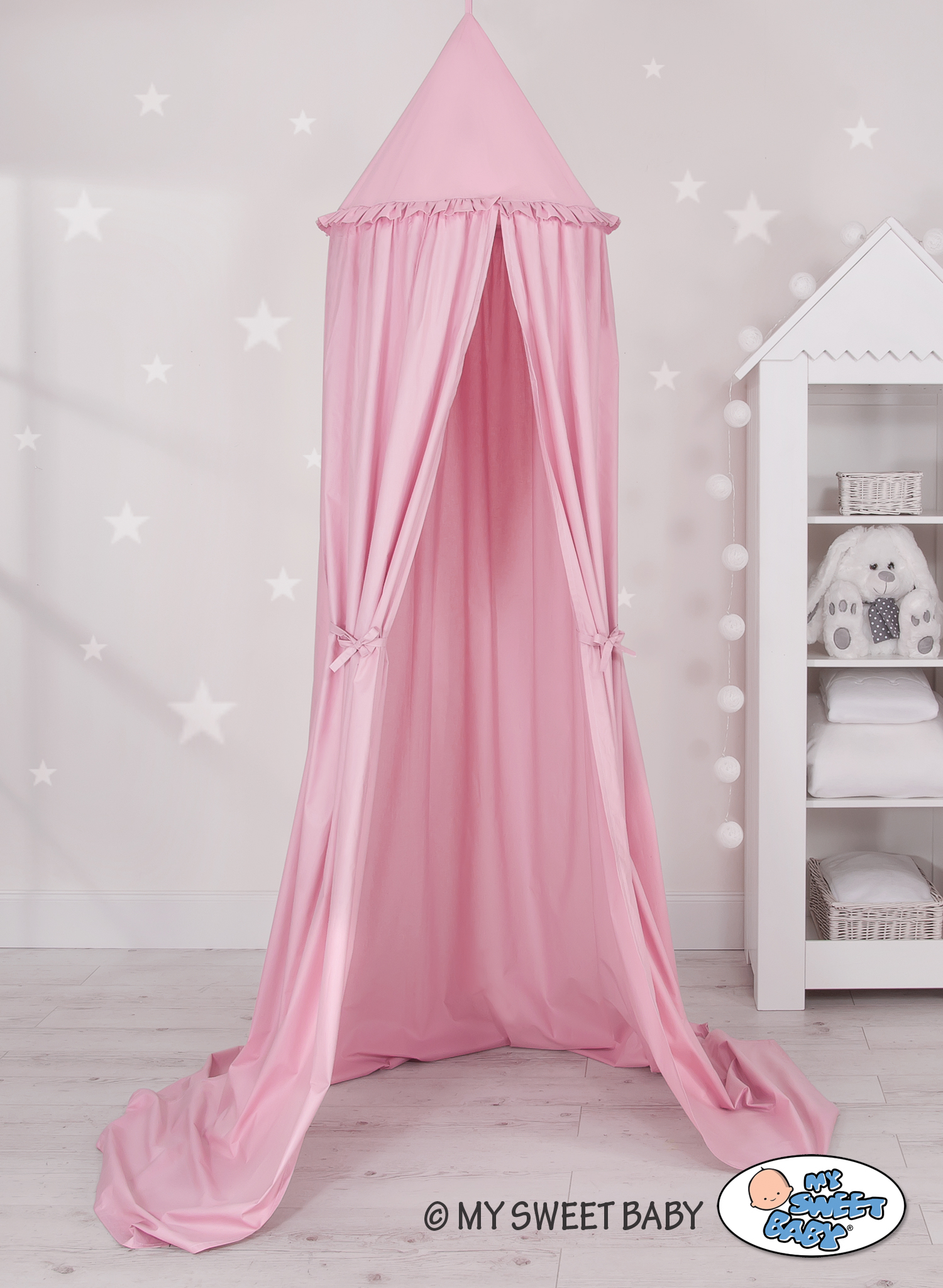 Efektowny wiszący baldachim, piękny element pokoju dziecięcego. Może służyć jako niepowtarzalna dekoracja łóżeczka dziecięcego. Jak również może stworzyć przytulne miejsce do zabawy. Zawieszony nad łóżeczkiem dziecięcym osłoni przed nadmiarem światła oraz wytłumi hałasy, tworząc wewnątrz łóżeczka przytulne i bezpieczne miejsce do odpoczynku. Baldachim można łatwo zamontować do sufitu. Jest długi ok. 260cm, dzięki czemu swobodnie ułoży się na ziemi, tworząc doskonałą kryjówkę i miejsce do zabawy.