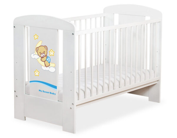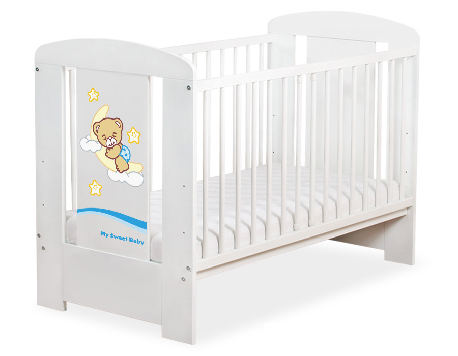 Drewniane białe łóżeczko dla niemowląt 120x60cm Dobranoc biało-niebieskie