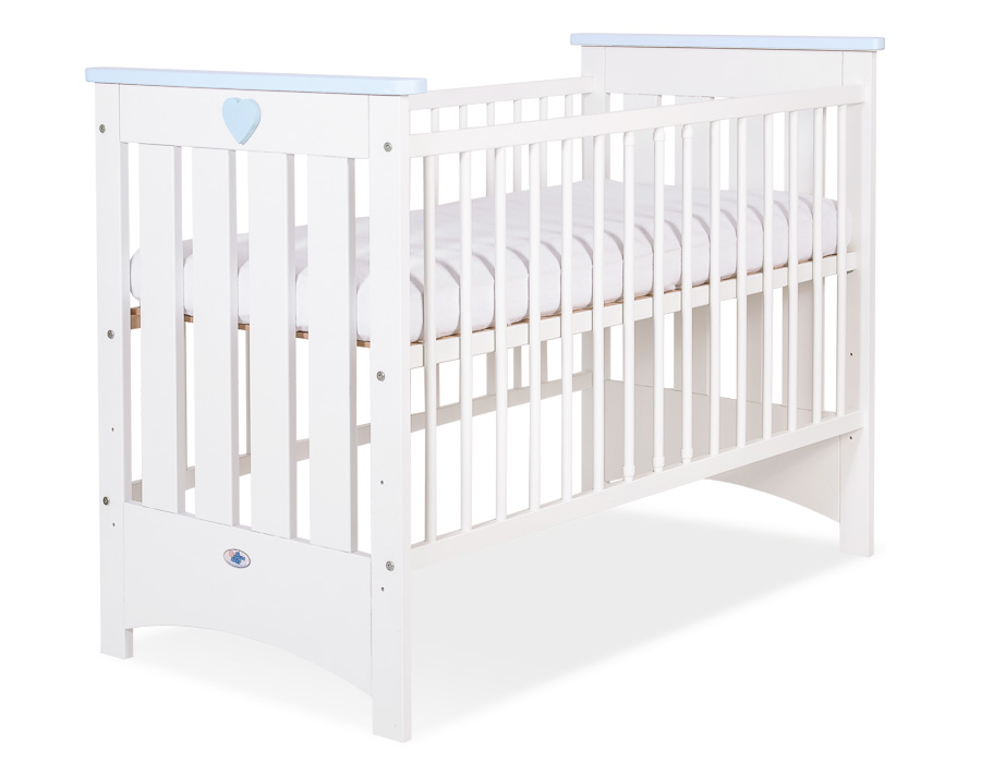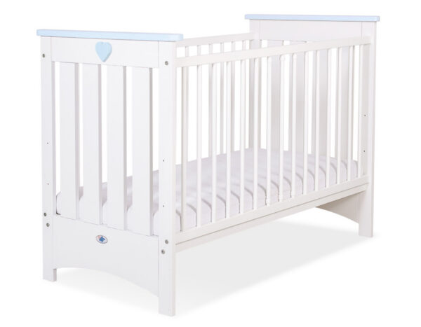 Białe drewniane łóżeczko z grubego solidnego drewna. Błękitne ozdobne listwy na frontach łóżeczka i błękitne serduszko z przodu łóżeczka tworzą delikatny pastelowy akcent ozdobny. Drewniane łóżeczko dla niemowląt – spełniające aktualną normę PN-EN 716-1:2017