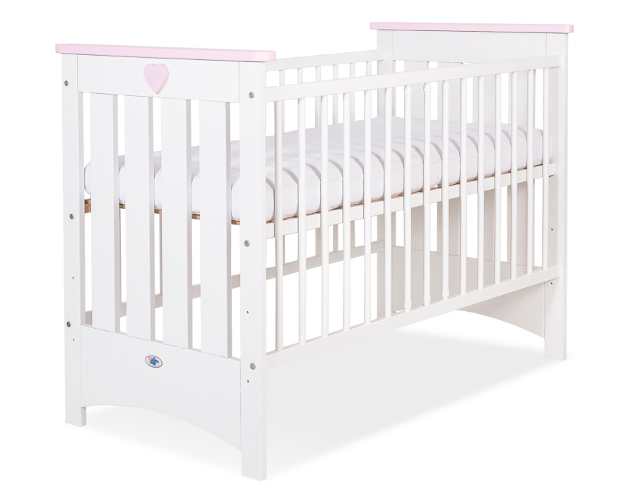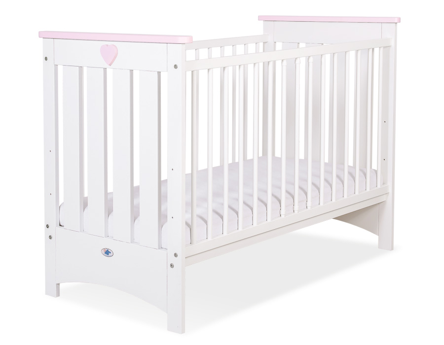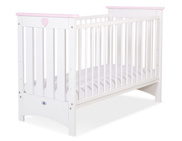 Białe drewniane łóżeczko z grubego solidnego drewna. Jasnoróżowe ozdobne listwy na frontach łóżeczka i jasnoróżowe serduszko z przodu łóżeczka tworzą delikatny pastelowy akcent ozdobny. Drewniane łóżeczko dla niemowląt – spełniające aktualną normę PN-EN 716-1:2017