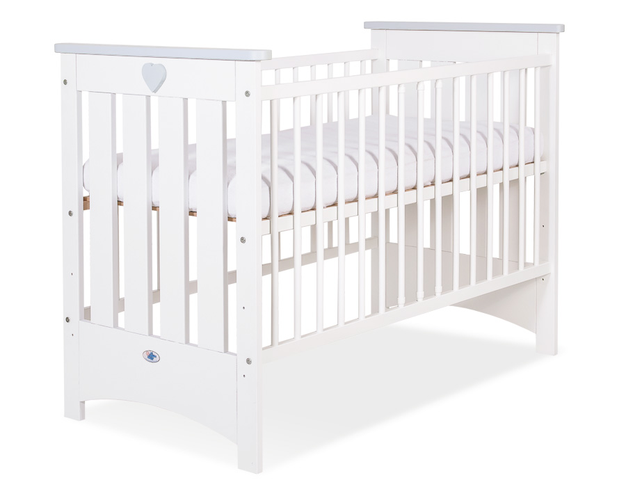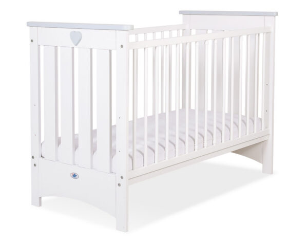 Białe drewniane łóżeczko z grubego solidnego drewna. Jasnoszare ozdobne listwy na frontach łóżeczka i jasnoszare serduszko z przodu łóżeczka tworzą delikatny pastelowy akcent ozdobny. Drewniane łóżeczko dla niemowląt – spełniające aktualną normę PN-EN 716-1:2017