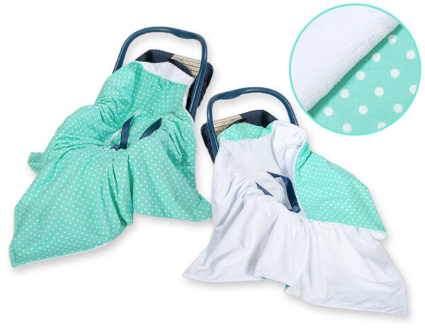 Duży otulacz dla niemowląt do fotelika nosidełka wózka dwustronny – Białe groszki na mięcie