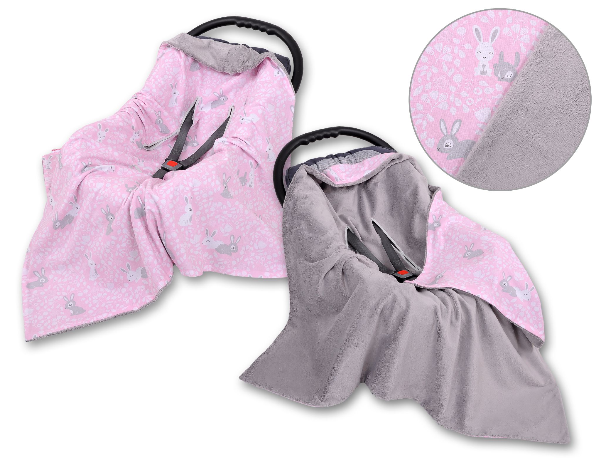 Duży otulacz dla niemowląt do fotelika nosidełka wózka dwustronny – króliczki różowe