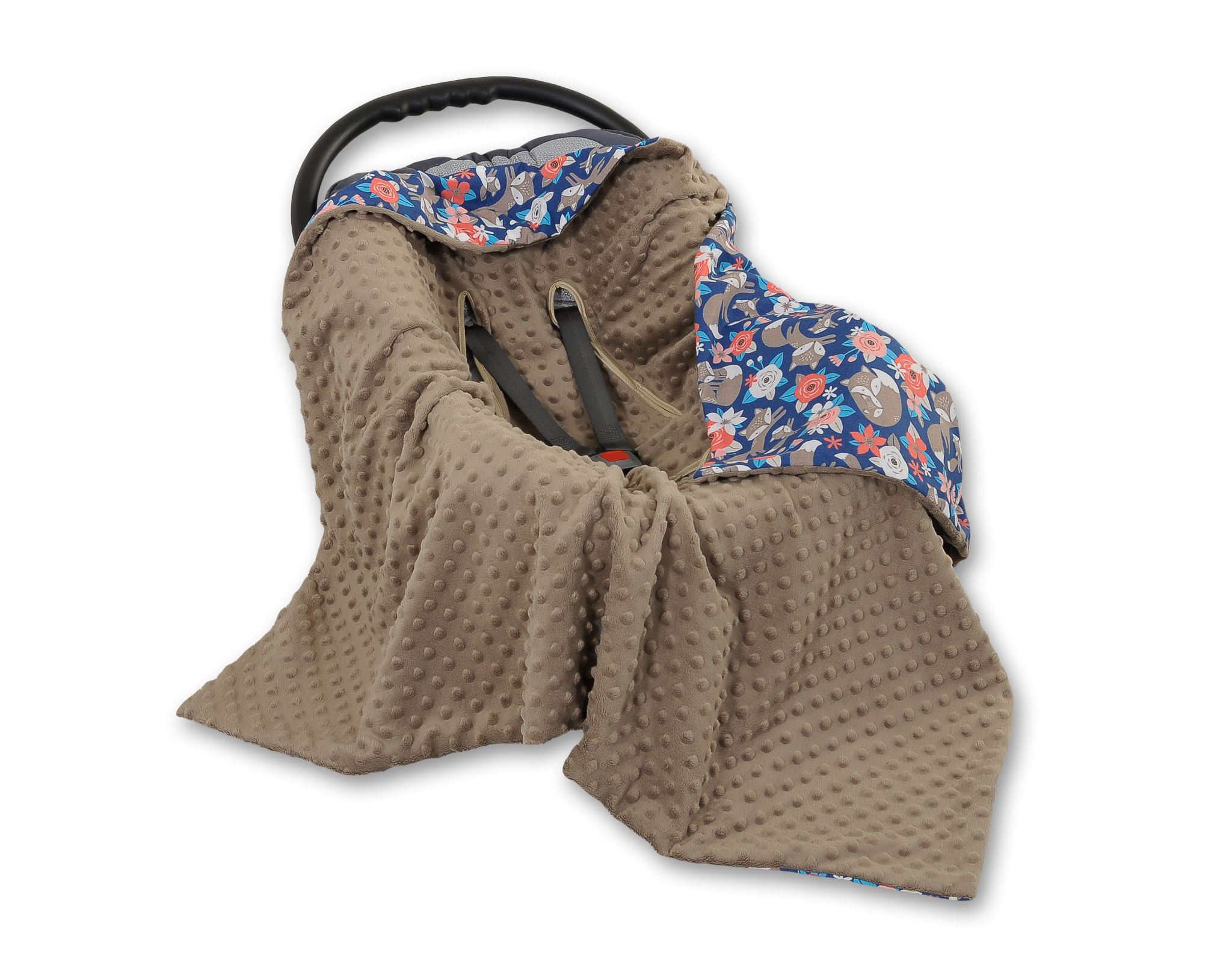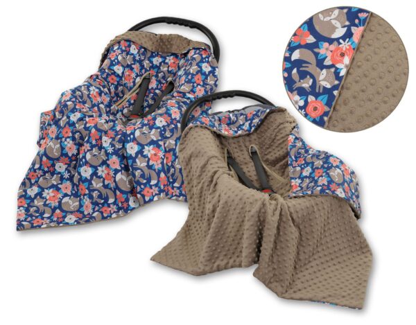 Wyjątkowo miękki, ciepły, dwustronny otulacz kocyk do fotelika- nosidełka zapewniający pełen komfort dziecku w trakcie jazdy samochodem. Wykonany z mięciutkiego materiału minky i kolorowej 100% bawełny.