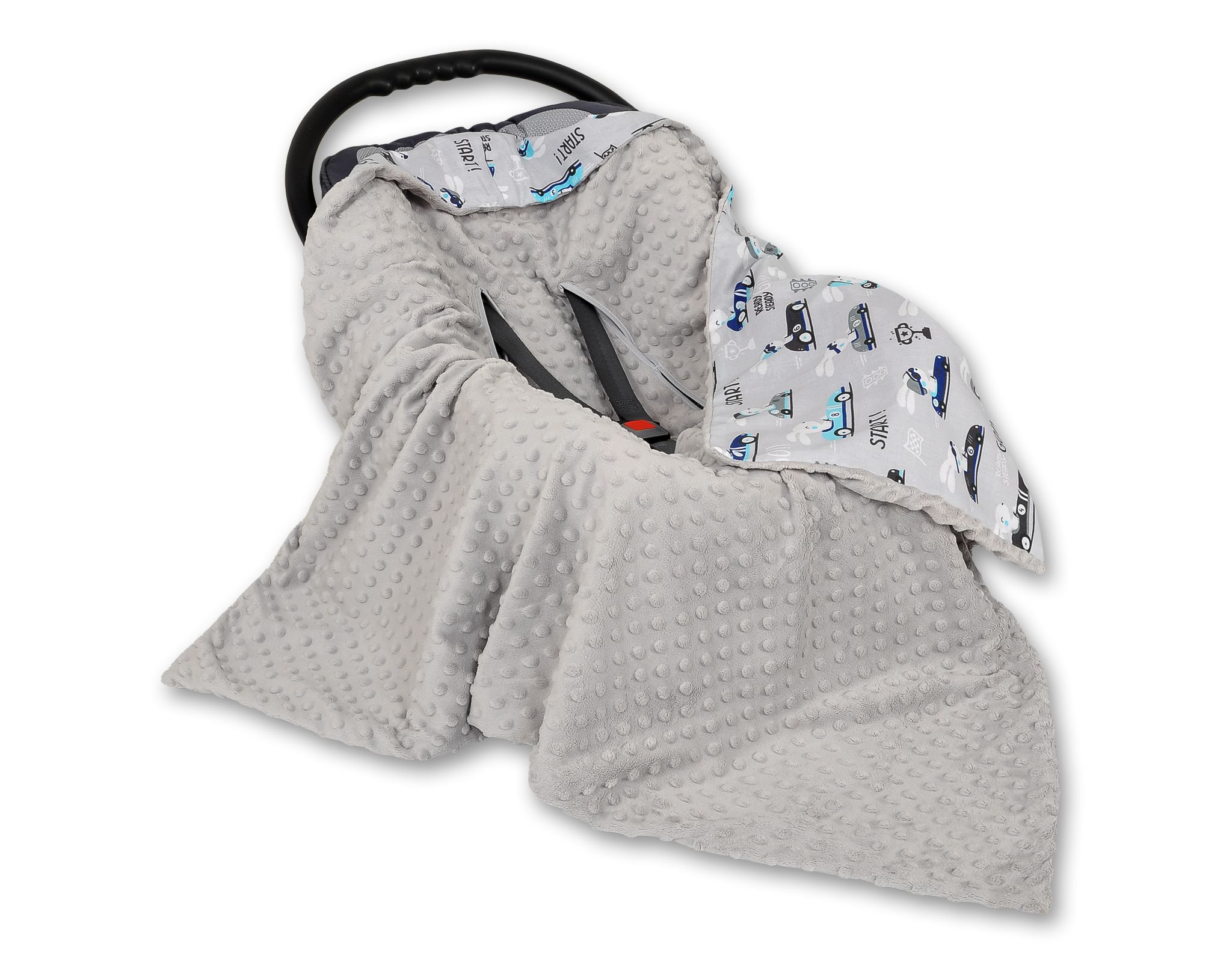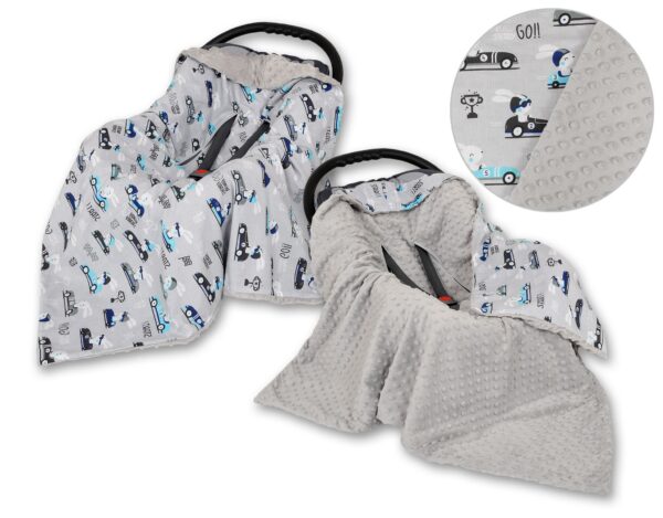 Wyjątkowo miękki, ciepły, dwustronny otulacz kocyk do fotelika- nosidełka zapewniający pełen komfort dziecku w trakcie jazdy samochodem. Wykonany z mięciutkiego materiału minky i kolorowej 100% bawełny.