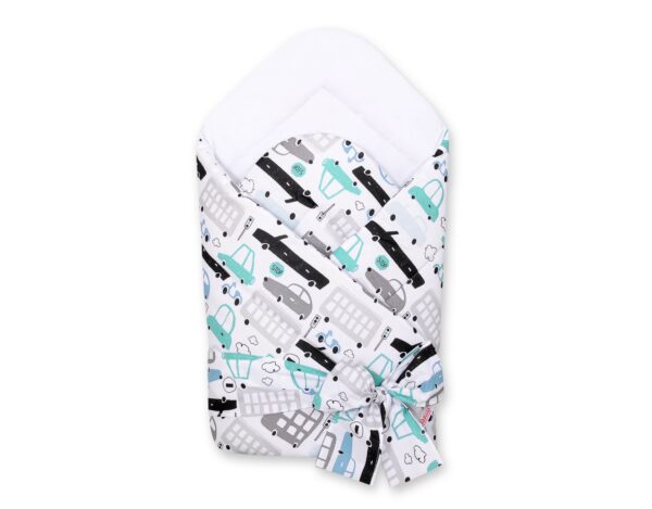 Dwustronny rożek dla niemowląt miękki z wiązaniem – autka szaro-turkusowe
