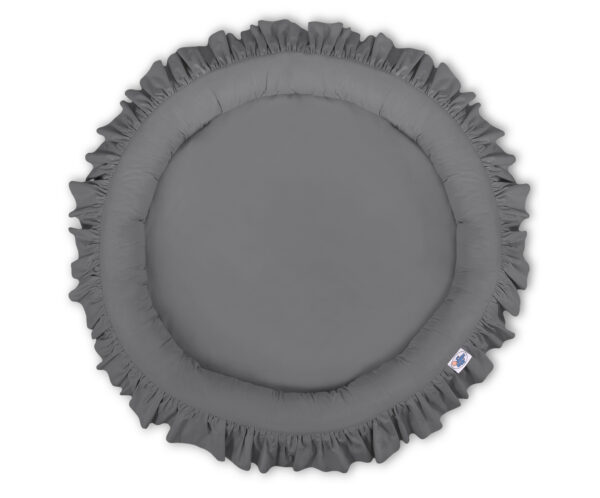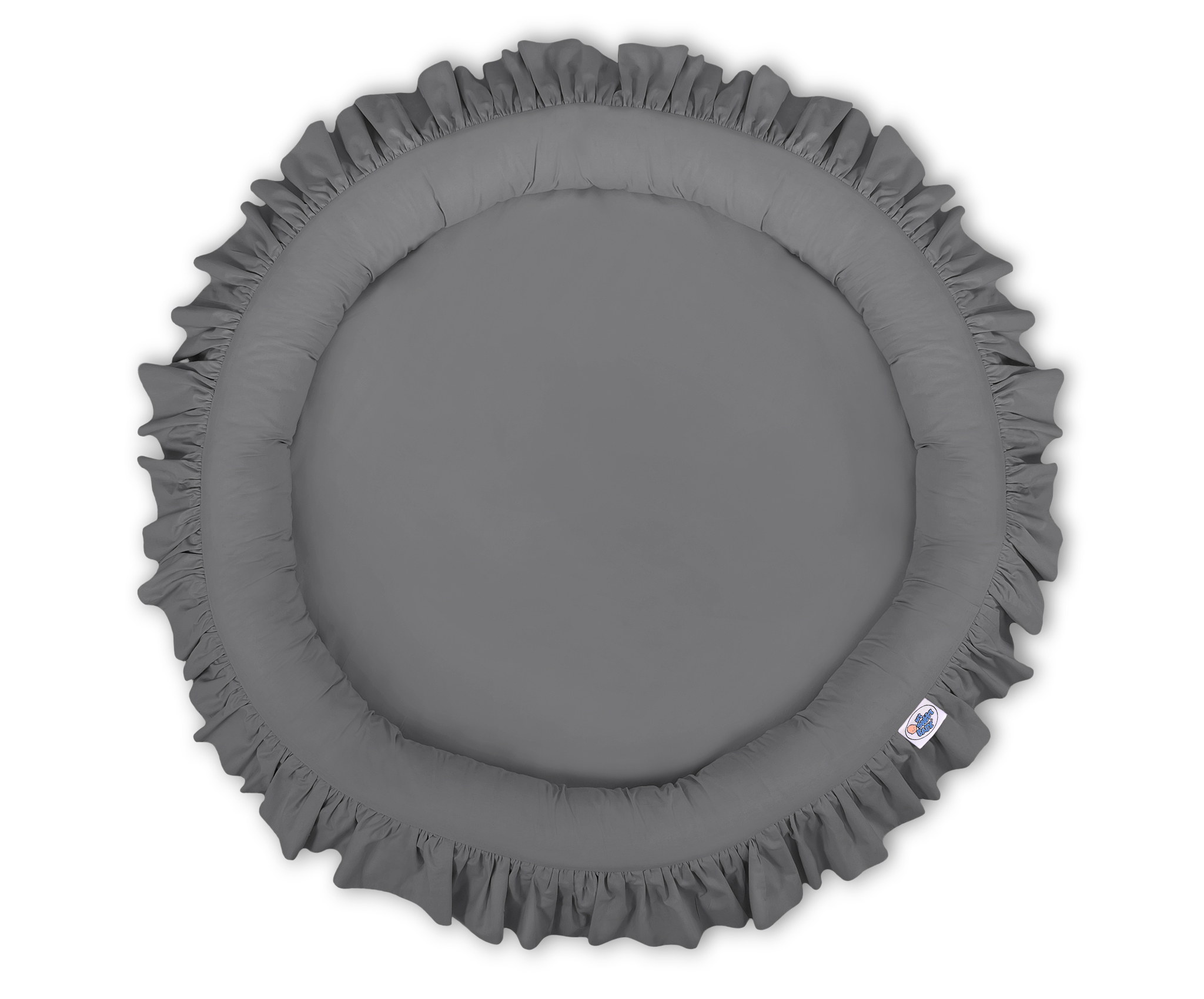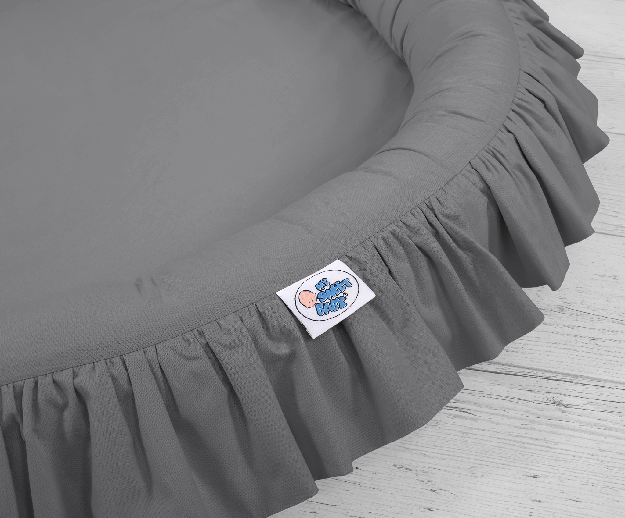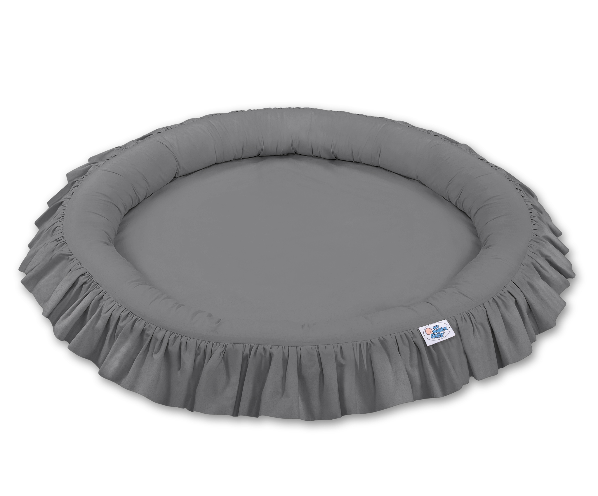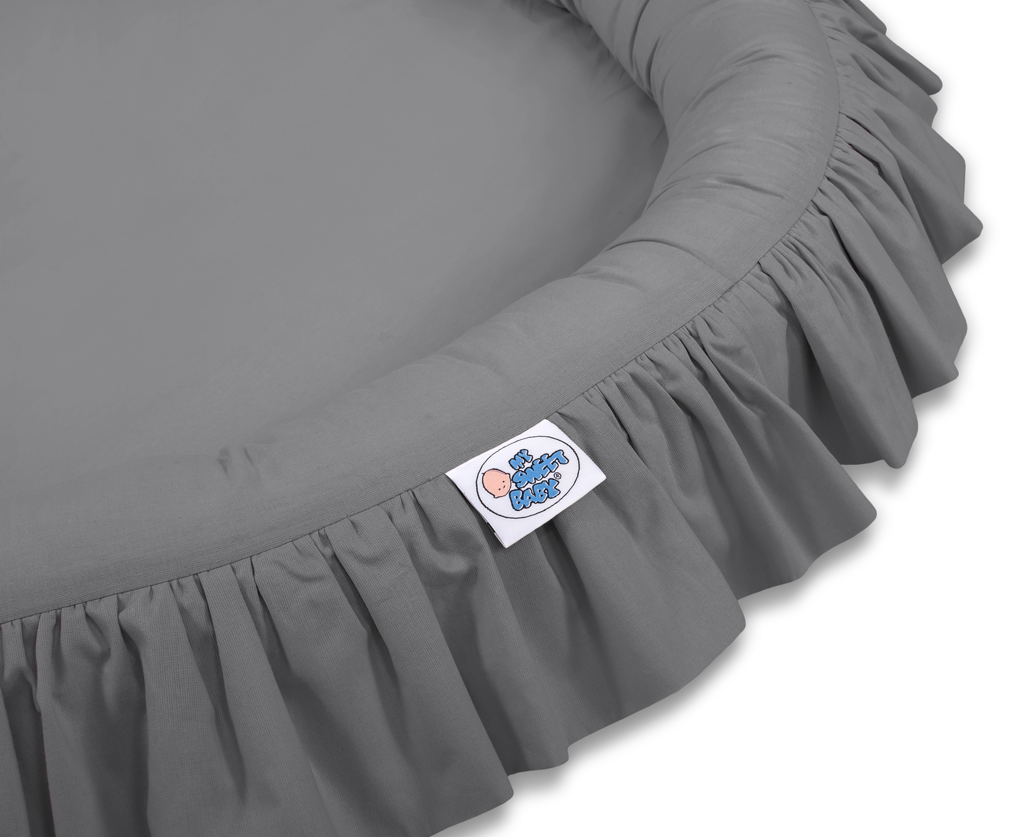 Oryginalne gniazdko z falbanką. Funkcjonalne i praktyczne. Doskonale sprawdzi się jako mini basenik, mata do zabawy lub „podłoga” baldachimu. Szerokie, okrągłe i mięciutkie ścianki zapewnią bezpieczną i udaną zabawę dla każdego malucha. Gniazdko może być używane już od pierwszych dni życia jako wygodny i bezpieczny kokon niemowlęcy a później jako przytulne miejsce do zabawy. Pokrowiec wykonany jest z tkaniny 100% bawełnianej, posiadającej atest Okotex. Boki gniazdka wypełnione są atestowanym włóknem Eco Fillball – mięciutkim włóknem uformowanym w malutkie kuleczki. Dzięki specjalnej technologii produkcji kuleczki te są puszyste i sprężyste, a przy tym w dotyku są miękkie i delikatne jak puch, zapewniają odpowiednią cyrkulację powietrza. Dno gniazdka, to specjalna wkładka wykonana z nowoczesnego antyalergicznego atestowanego surowca. Gniazdko łatwo utrzymać w czystości, pokrowiec jest rozbieralny – można prać w pralce w 30 stopniach.