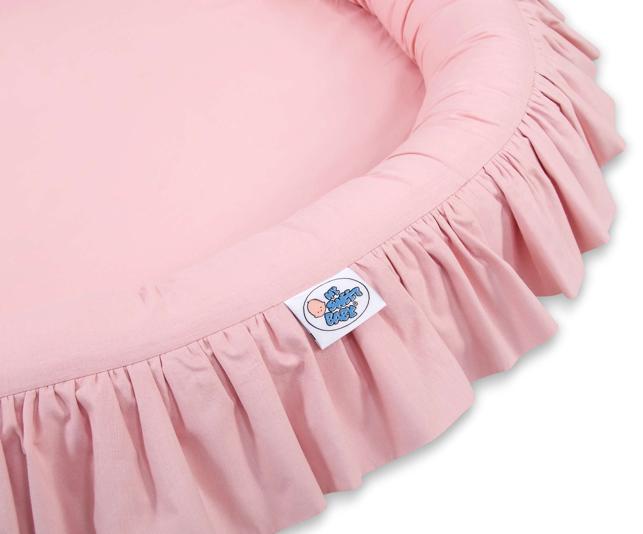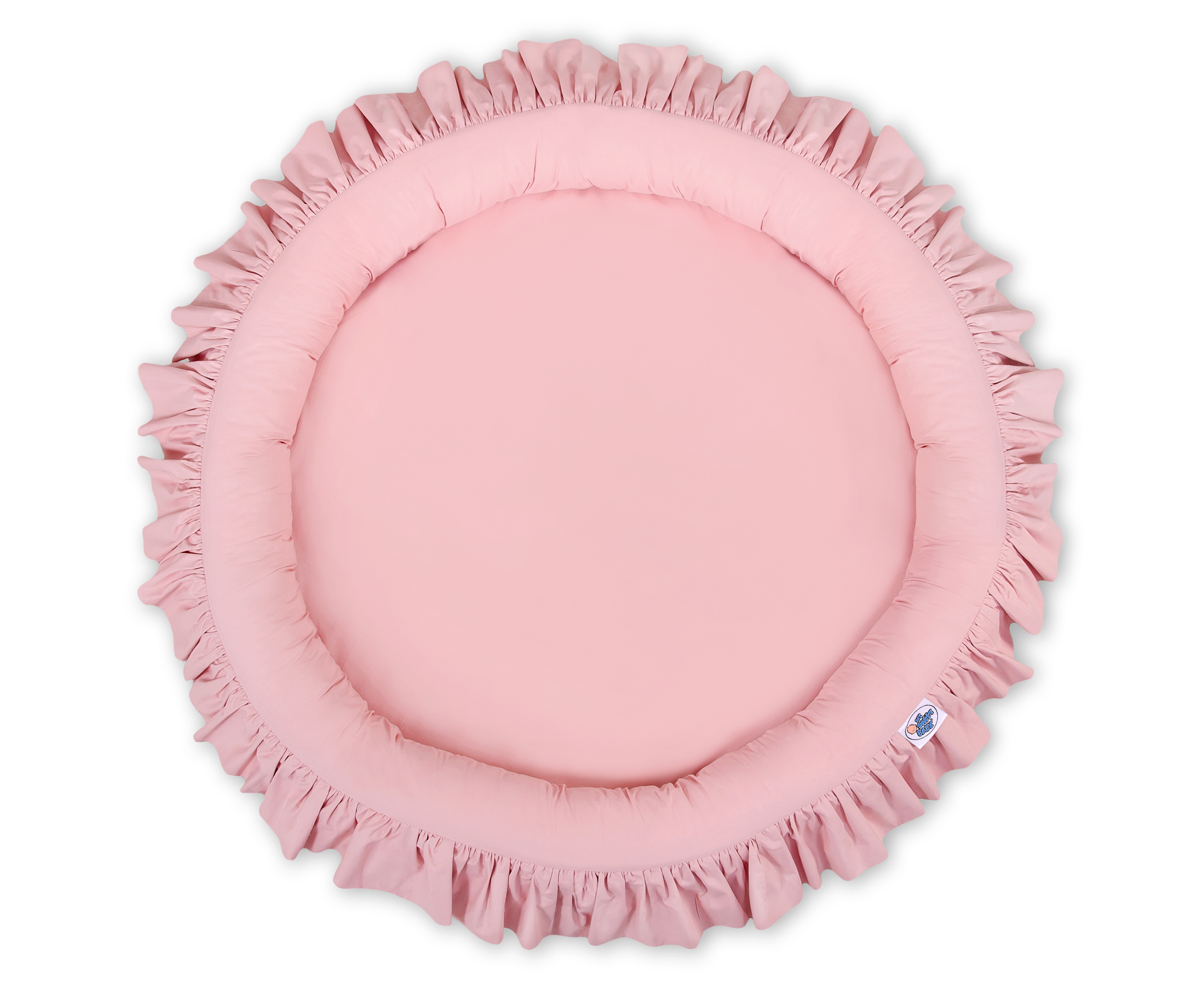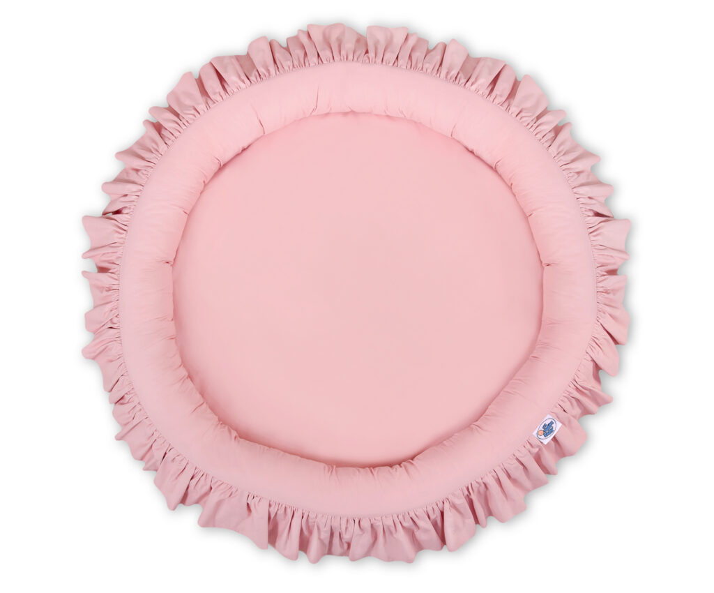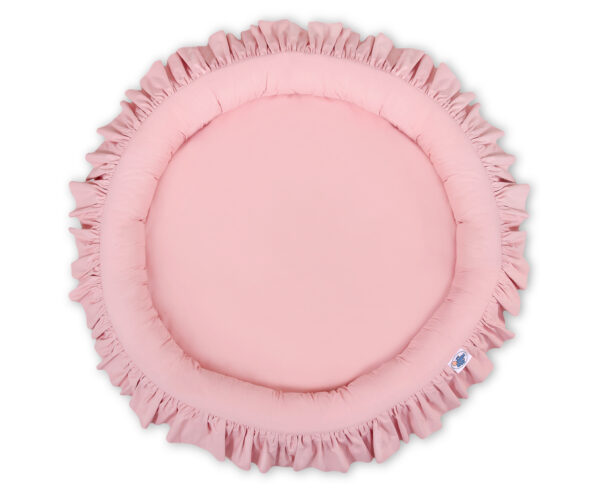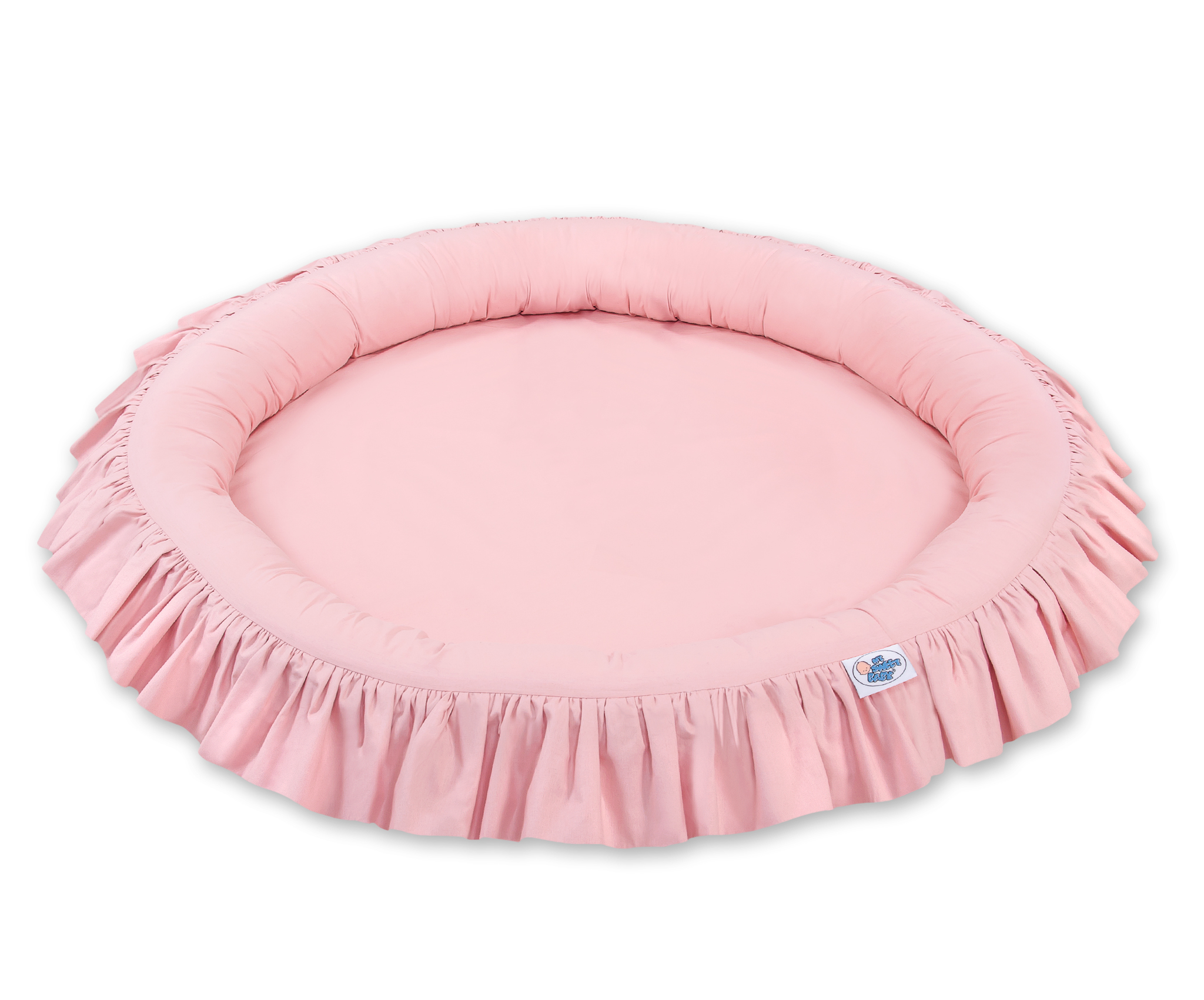 Oryginalne gniazdko z falbanką. Funkcjonalne i praktyczne. Doskonale sprawdzi się jako mini basenik, mata do zabawy lub „podłoga” baldachimu. Szerokie, okrągłe i mięciutkie ścianki zapewnią bezpieczną i udaną zabawę dla każdego malucha. Gniazdko może być używane już od pierwszych dni życia jako wygodny i bezpieczny kokon niemowlęcy a później jako przytulne miejsce do zabawy. Pokrowiec wykonany jest z tkaniny 100% bawełnianej, posiadającej atest Okotex. Boki gniazdka wypełnione są atestowanym włóknem Eco Fillball – mięciutkim włóknem uformowanym w malutkie kuleczki. Dzięki specjalnej technologii produkcji kuleczki te są puszyste i sprężyste, a przy tym w dotyku są miękkie i delikatne jak puch, zapewniają odpowiednią cyrkulację powietrza. Dno gniazdka, to specjalna wkładka wykonana z nowoczesnego antyalergicznego atestowanego surowca. Gniazdko łatwo utrzymać w czystości, pokrowiec jest rozbieralny – można prać w pralce w 30 stopniach.