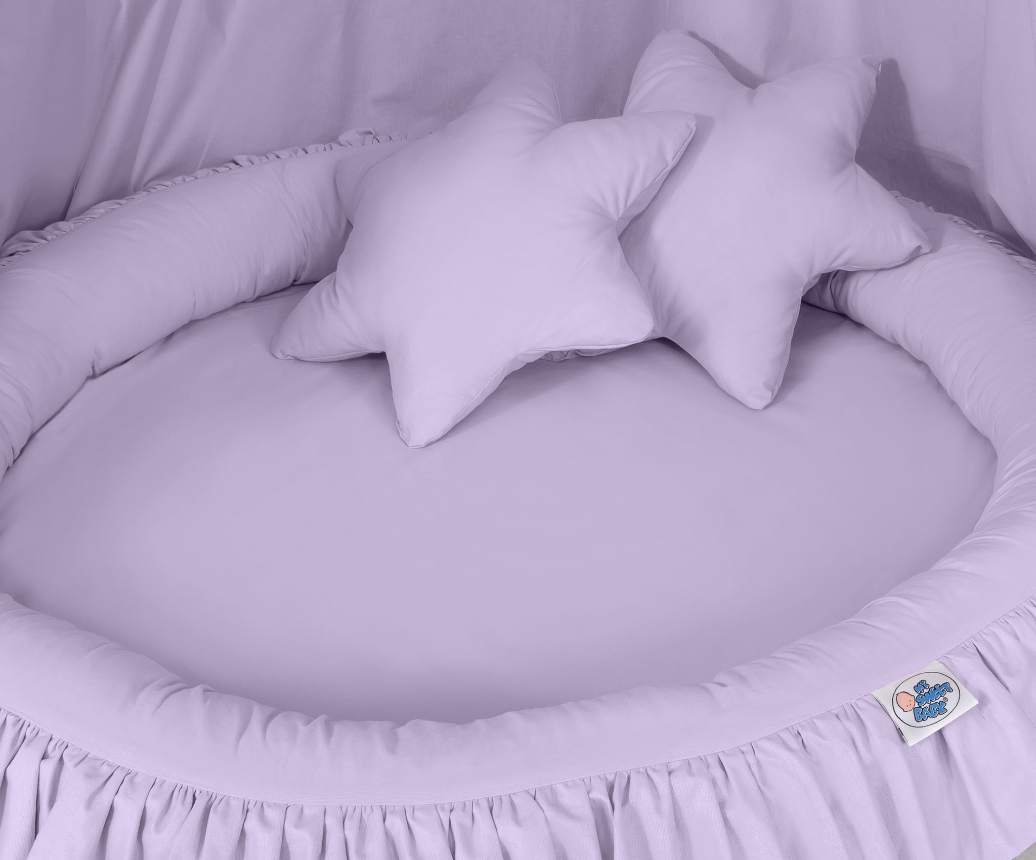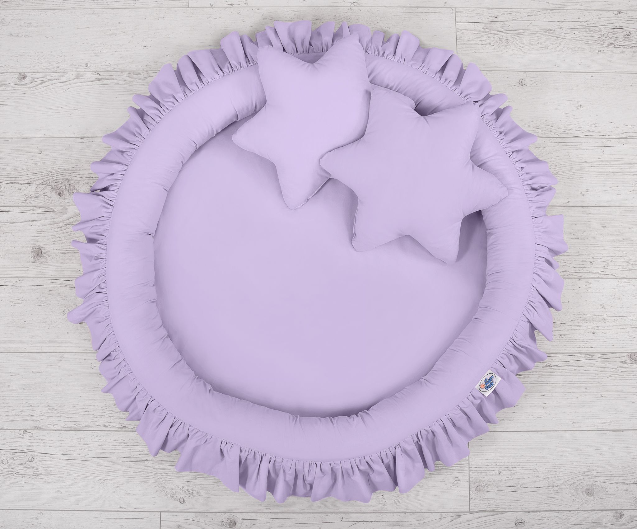 Oryginalne gniazdko z falbanką. Funkcjonalne i praktyczne. Doskonale sprawdzi się jako mini basenik, mata do zabawy lub „podłoga” baldachimu zawieszonego na suficie. Szerokie, okrągłe i mięciutkie ścianki zapewnią bezpieczną i udaną zabawę dla każdego malucha. Gniazdko może być używane już od pierwszych dni życia jako wygodny i bezpieczny kokon niemowlęcy a później jako przytulne miejsce do zabawy. Pokrowiec wykonany jest z tkaniny 100% bawełnianej, posiadającej atest Okotex. Boki gniazdka wypełnione są atestowanym włóknem Eco Fillball – mięciutkim włóknem uformowanym w malutkie kuleczki. Dzięki specjalnej technologii produkcji kuleczki te są puszyste i sprężyste, a przy tym w dotyku są miękkie i delikatne jak puch, zapewniają odpowiednią cyrkulację powietrza. Dno gniazdka miękki materacyk to specjalna wkładka wykonana z nowoczesnego antyalergicznego atestowanego surowca. Gniazdko łatwo utrzymać w czystości, pokrowiec jest rozbieralny – można prać w pralce.