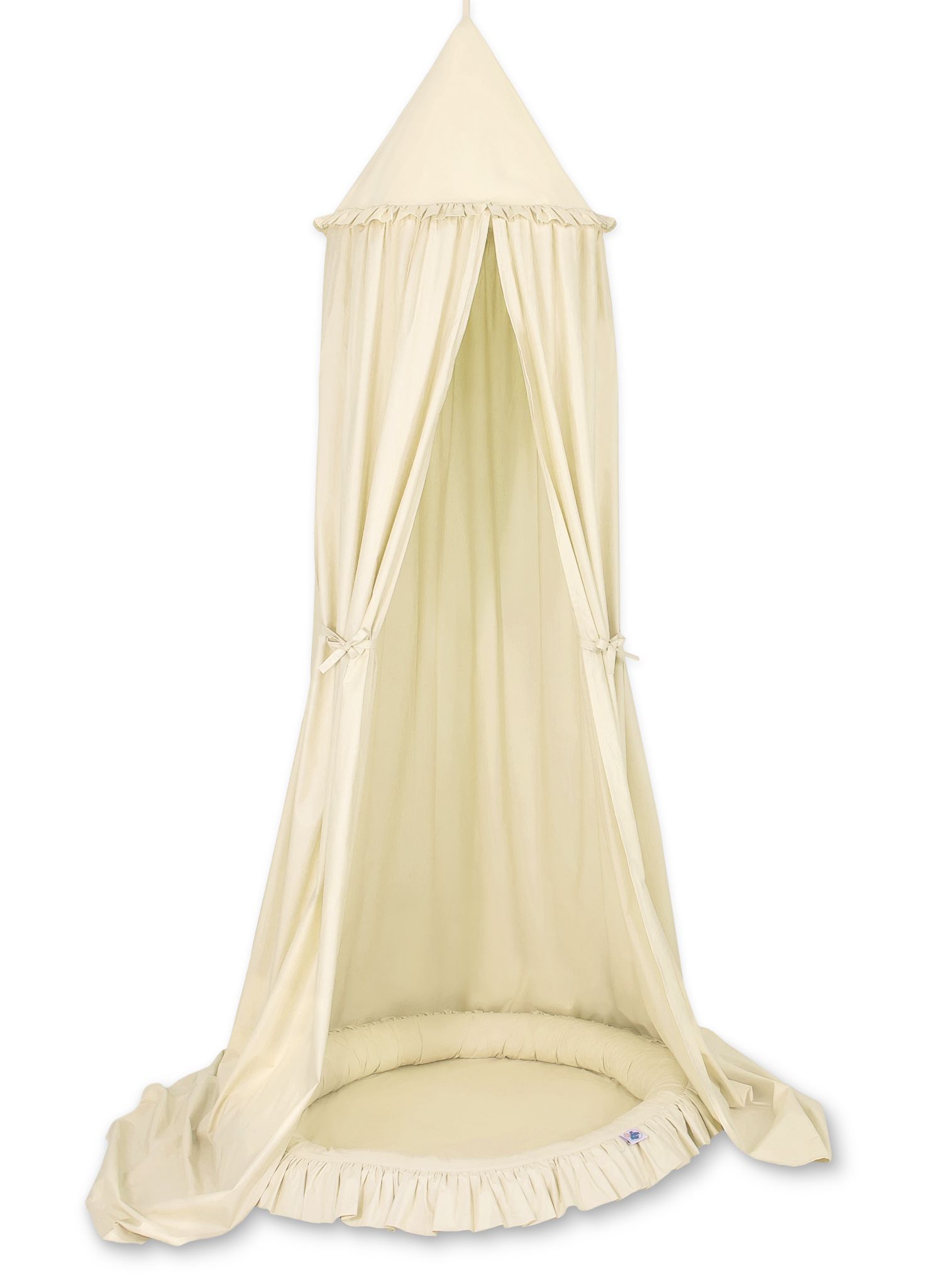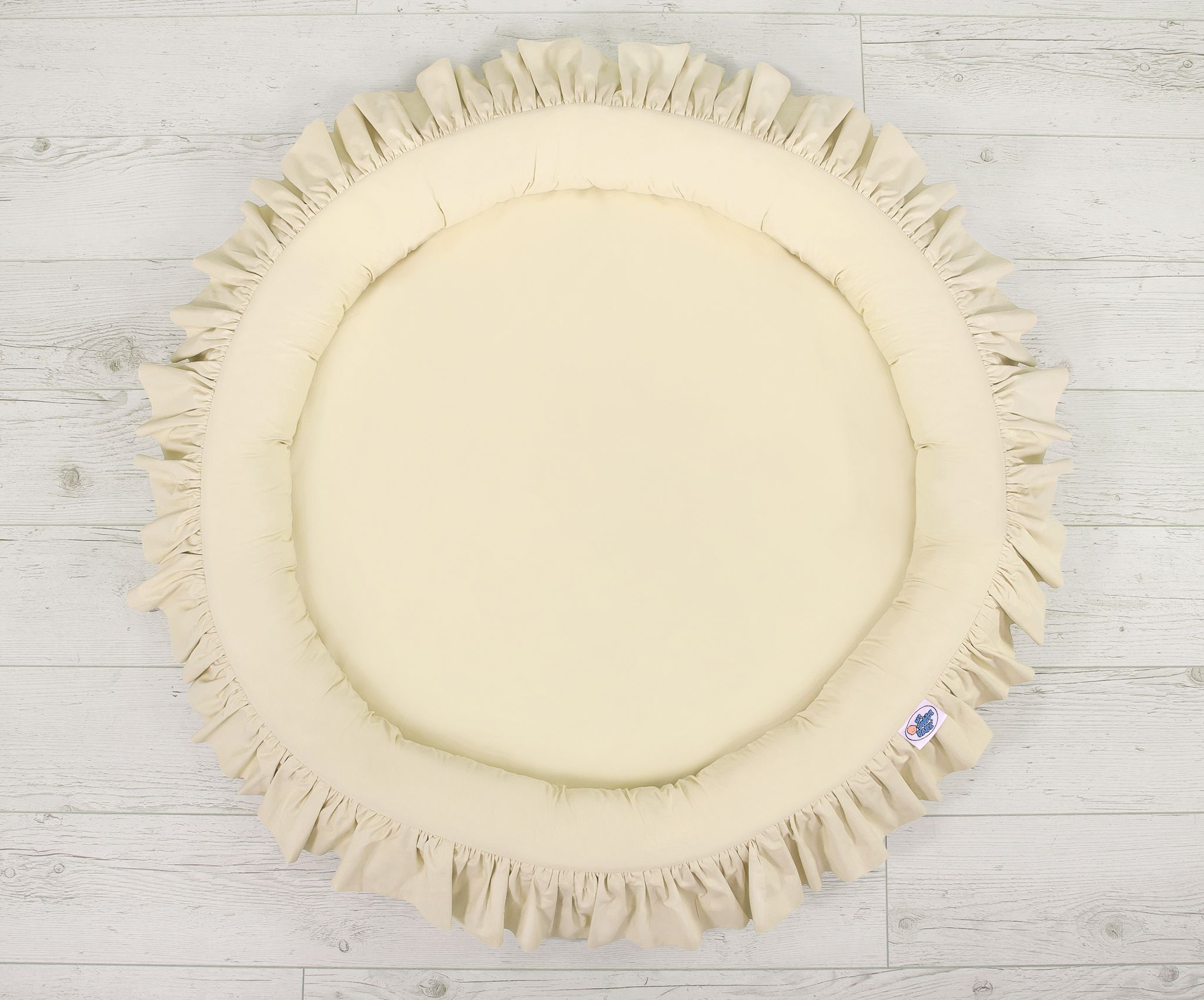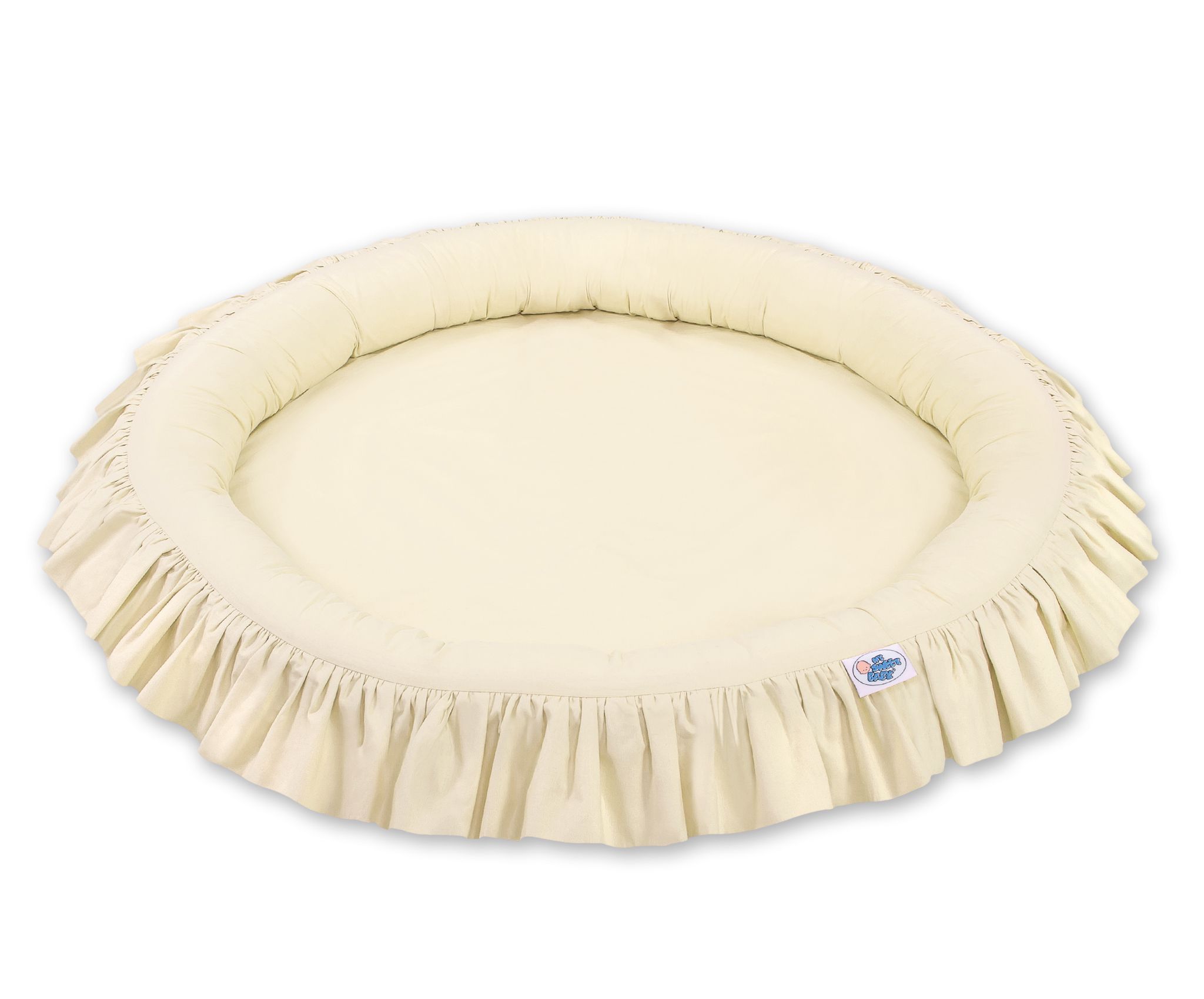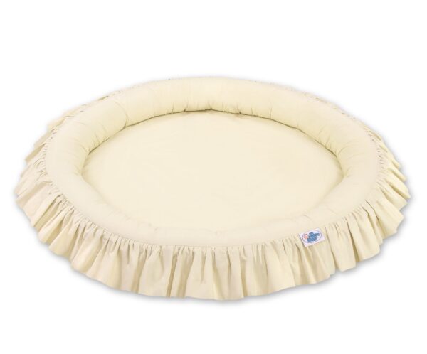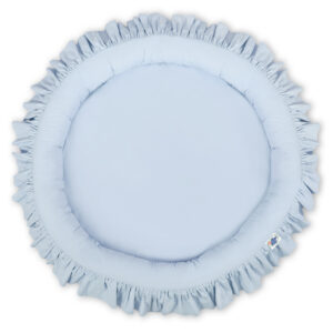 Oryginalne gniazdko z falbanką. Funkcjonalne i praktyczne. Doskonale sprawdzi się jako mini basenik, mata do zabawy lub „podłoga” baldachimu. Szerokie, okrągłe i mięciutkie ścianki zapewnią bezpieczną i udaną zabawę dla każdego malucha. Gniazdko może być używane już od pierwszych dni życia jako wygodny i bezpieczny kokon niemowlęcy a później jako przytulne miejsce do zabawy. Pokrowiec wykonany jest z tkaniny 100% bawełnianej, posiadającej atest Okotex. Boki gniazdka wypełnione są atestowanym włóknem Eco Fillball – mięciutkim włóknem uformowanym w malutkie kuleczki. Dzięki specjalnej technologii produkcji kuleczki te są puszyste i sprężyste, a przy tym w dotyku są miękkie i delikatne jak puch, zapewniają odpowiednią cyrkulację powietrza. Dno gniazdka, to specjalna wkładka wykonana z nowoczesnego antyalergicznego atestowanego surowca. Gniazdko łatwo utrzymać w czystości, pokrowiec jest rozbieralny – można prać w pralce w 30 stopniach.