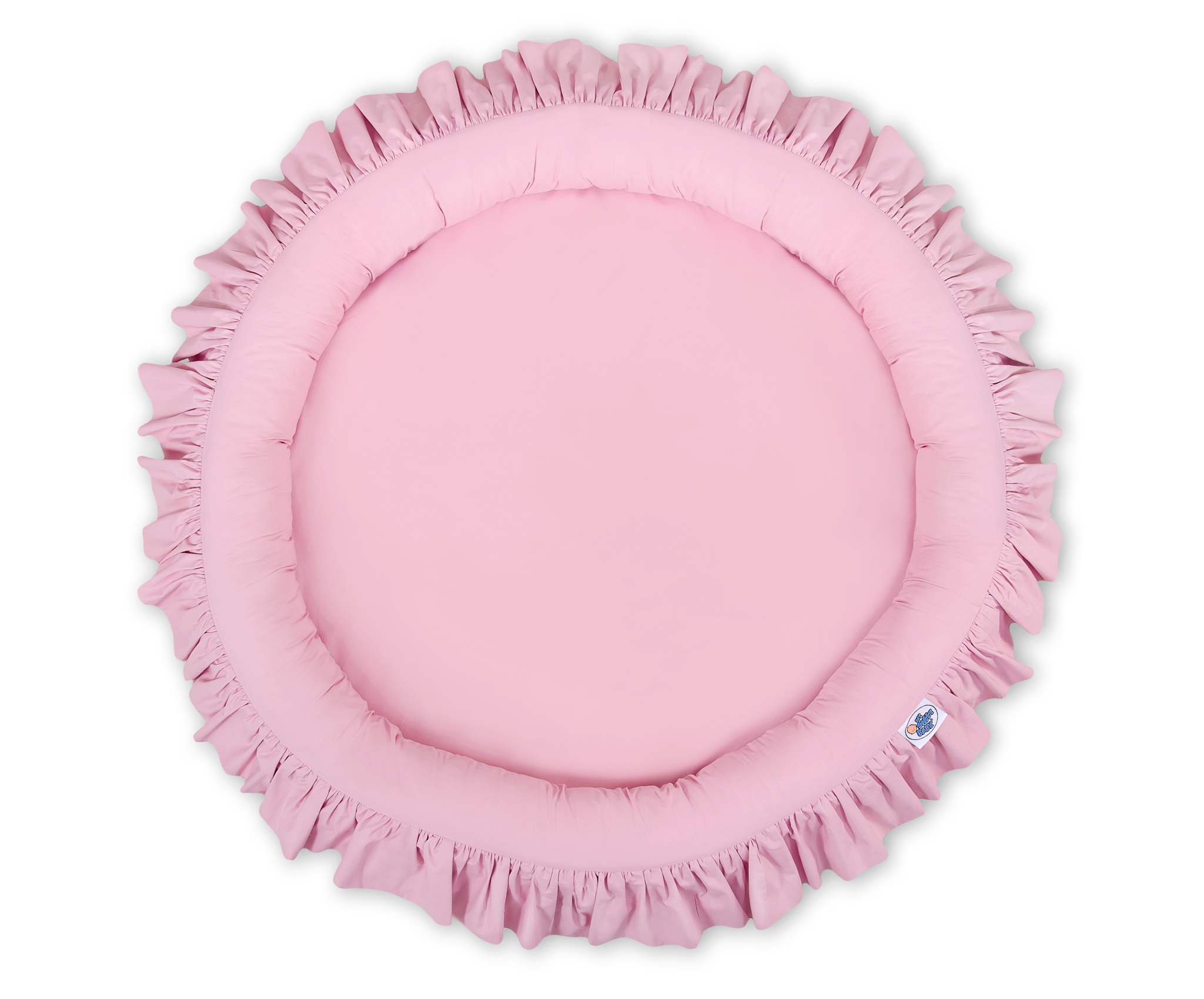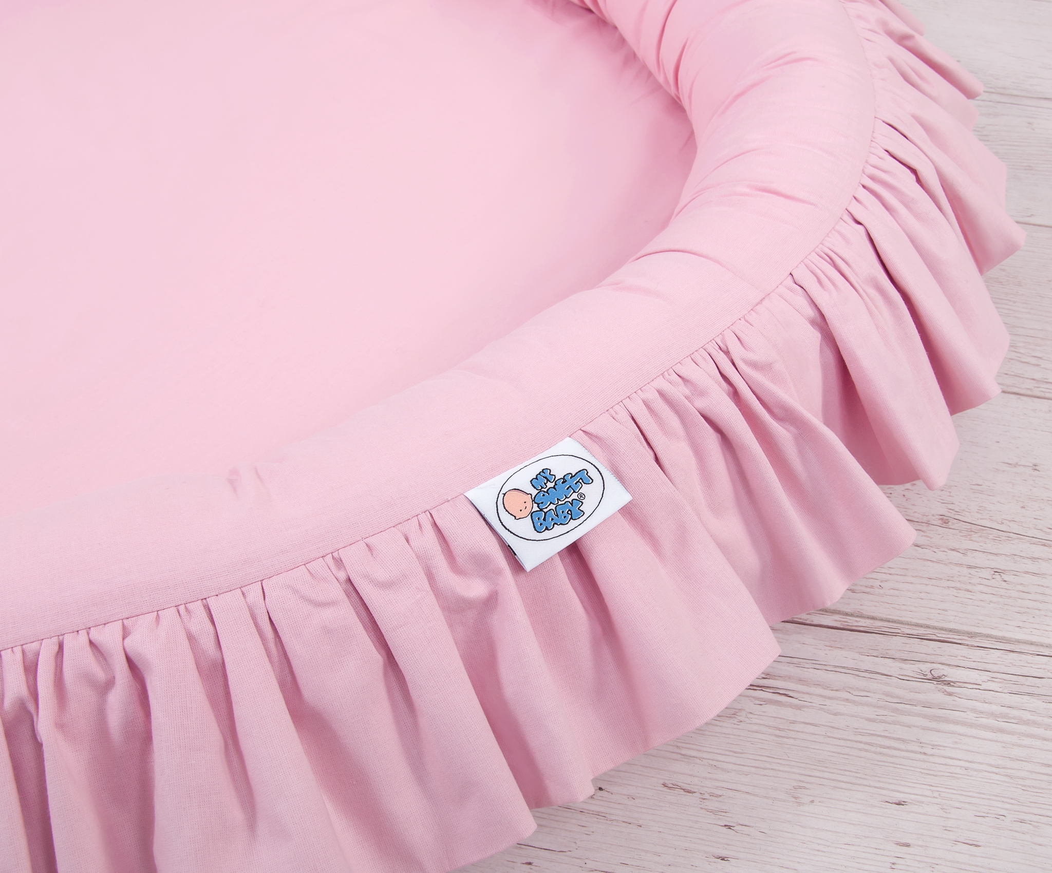 Oryginalne gniazdko z falbanką. Funkcjonalne i praktyczne. Doskonale sprawdzi się jako mini basenik, mata do zabawy lub „podłoga” baldachimu. Szerokie, okrągłe i mięciutkie ścianki zapewnią bezpieczną i udaną zabawę dla każdego malucha. Gniazdko może być używane już od pierwszych dni życia jako wygodny i bezpieczny kokon niemowlęcy a później jako przytulne miejsce do zabawy. Pokrowiec wykonany jest z tkaniny 100% bawełnianej, posiadającej atest Okotex. Boki gniazdka wypełnione są atestowanym włóknem Eco Fillball – mięciutkim włóknem uformowanym w malutkie kuleczki. Dzięki specjalnej technologii produkcji kuleczki te są puszyste i sprężyste, a przy tym w dotyku są miękkie i delikatne jak puch, zapewniają odpowiednią cyrkulację powietrza. Dno gniazdka, to specjalna wkładka wykonana z nowoczesnego antyalergicznego atestowanego surowca. Gniazdko łatwo utrzymać w czystości, pokrowiec jest rozbieralny – można prać w pralce w 30 stopniach.