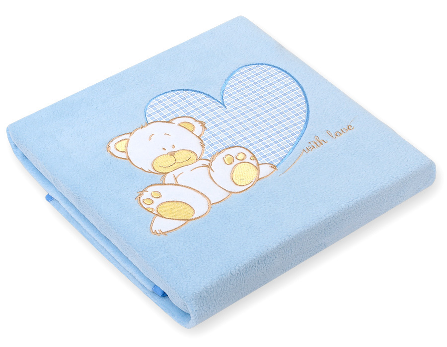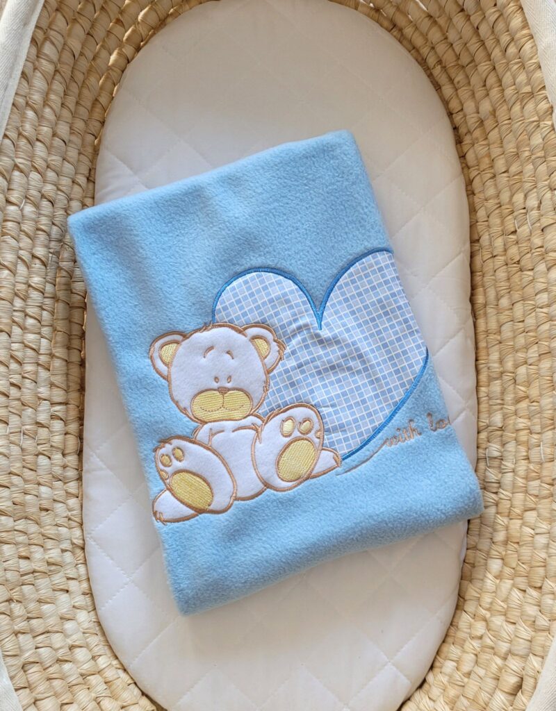 Kocyk polarowy dla niemowląt – Milo- Miś z sercem niebieski