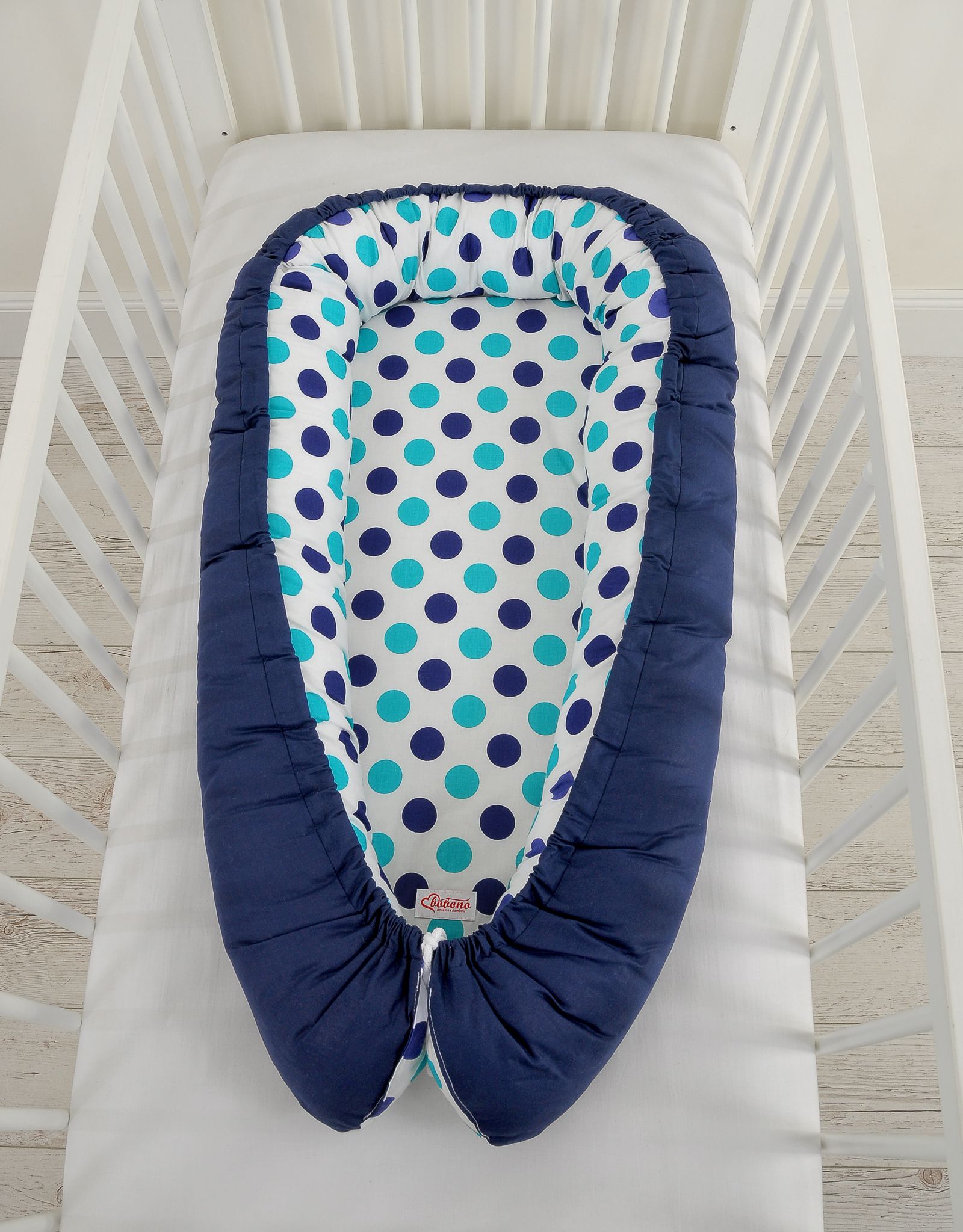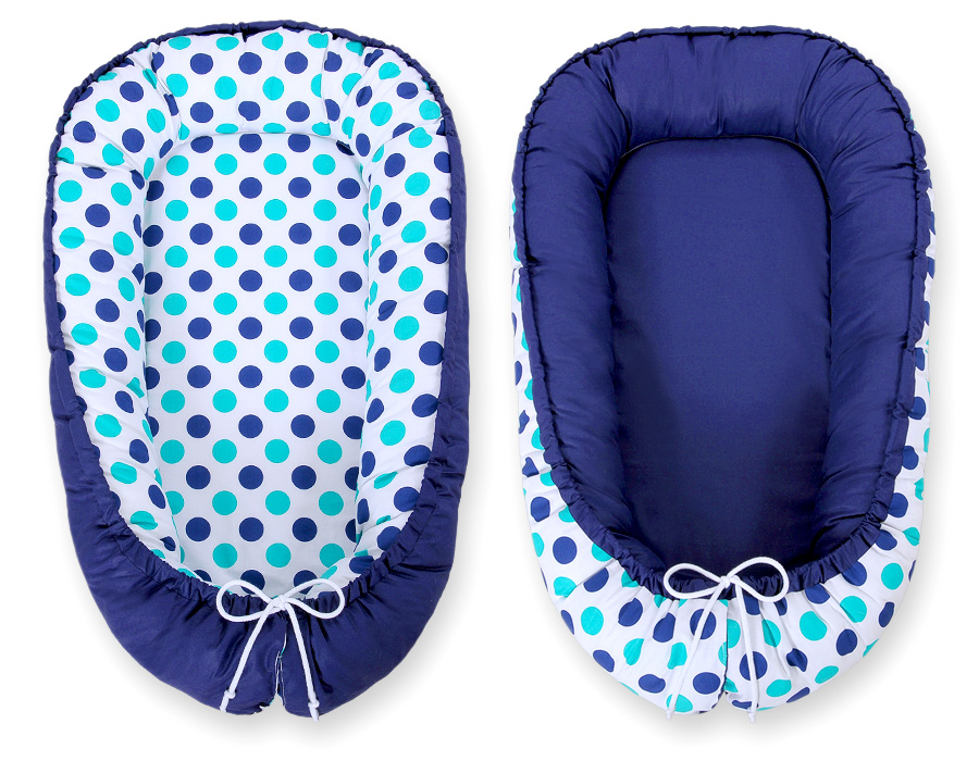 Kokon niemowlęcy dwustronny kojec otulacz Premium BOBONO- grochy miętowo-granatowe