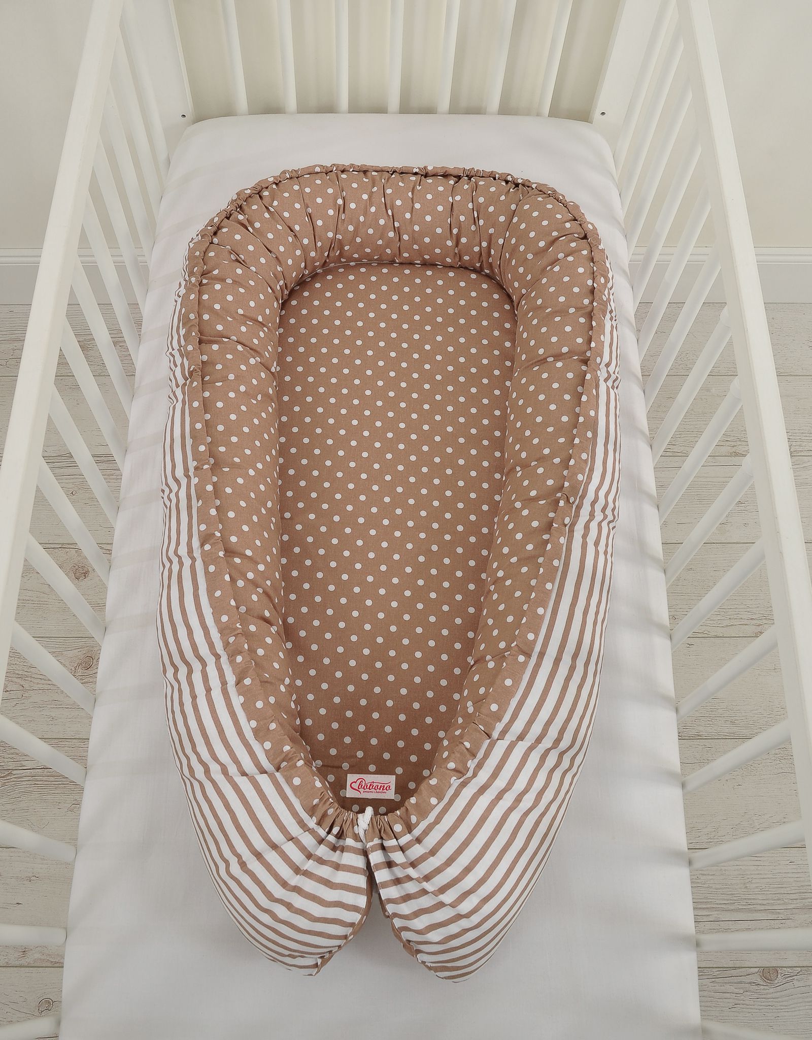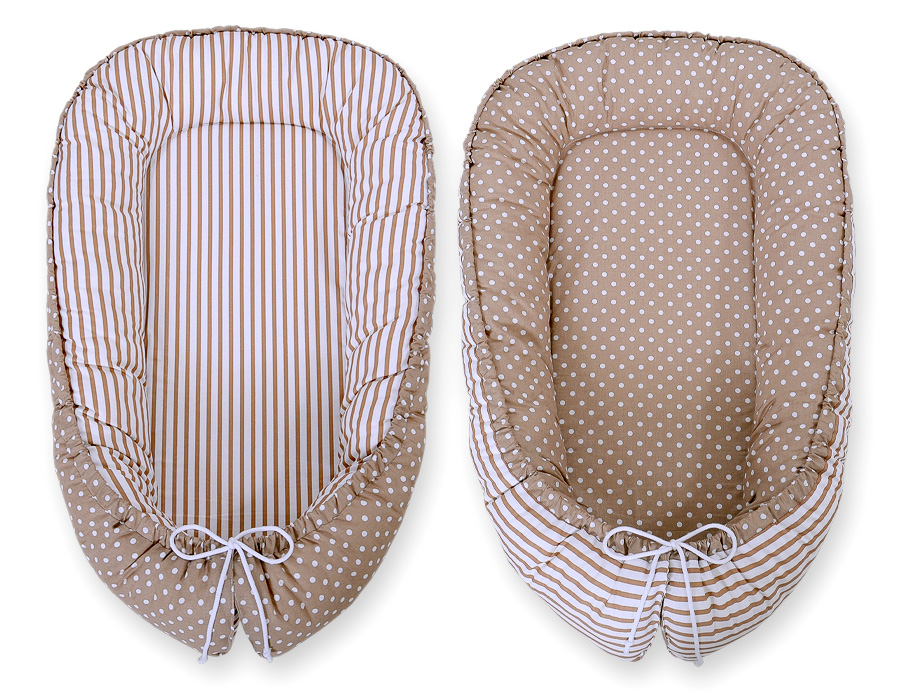 Kokon niemowlęcy dwustronny kojec otulacz Premium BOBONO- grochy na brązie/paski
