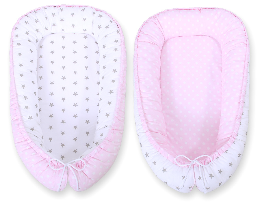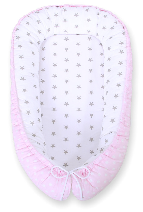 Kokon niemowlęcy dwustronny kojec otulacz Premium BOBONO- grochy na różu/ szare gwiazdki