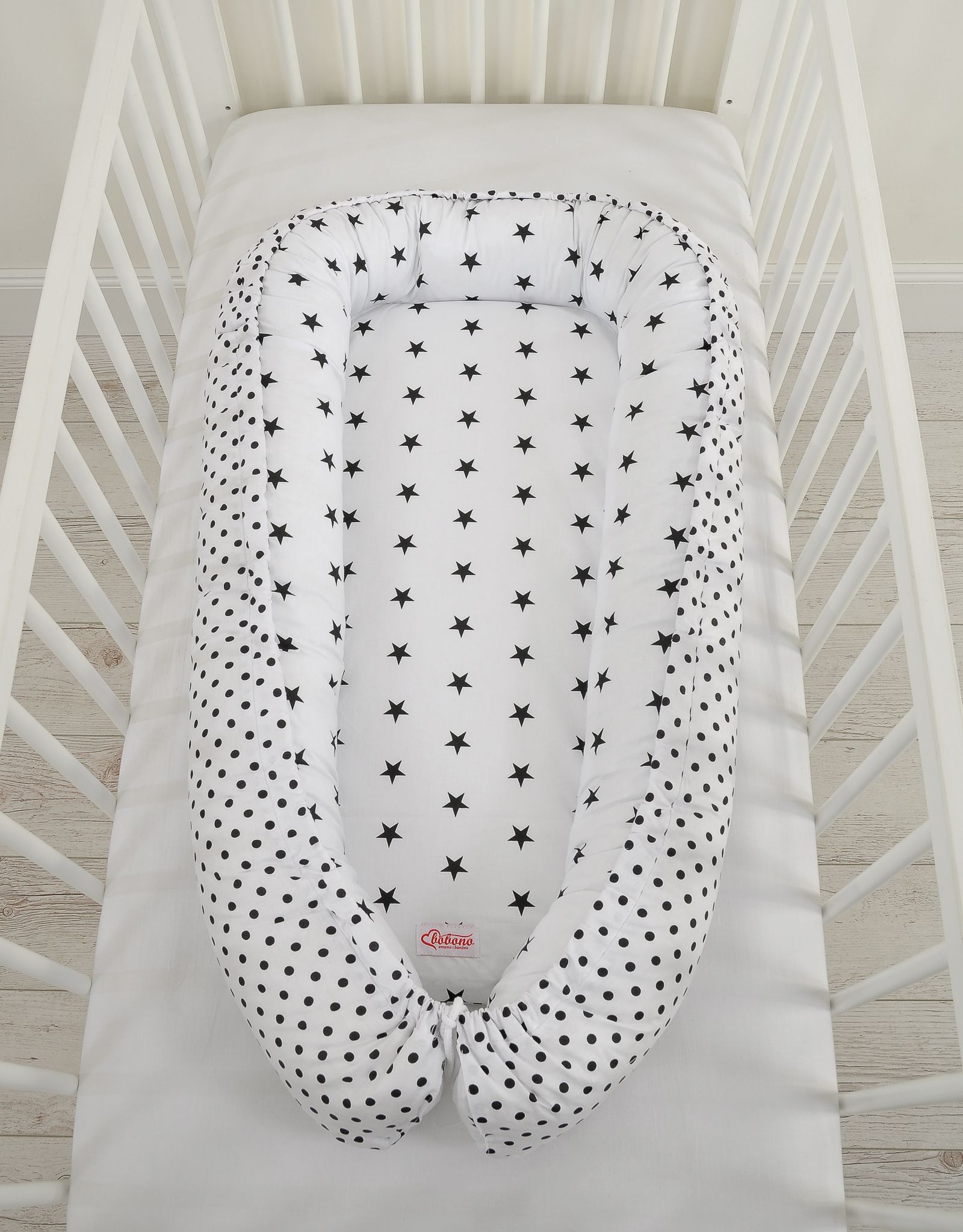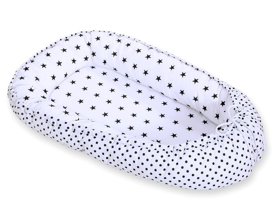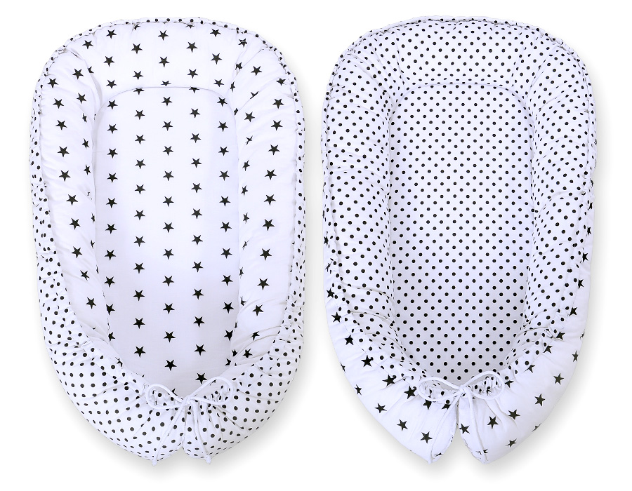 Kokon niemowlęcy dwustronny kojec otulacz Premium BOBONO- gwiazdki czarne/ grochy
