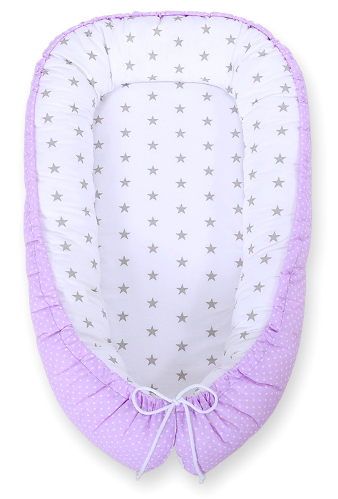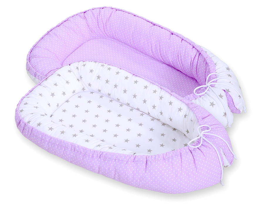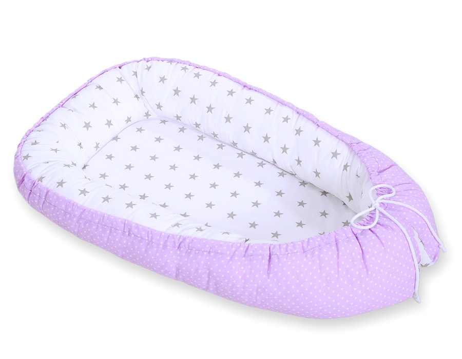 Kokon niemowlęcy dwustronny kojec otulacz Premium BOBONO- kropki na fiolecie/ gwiazdki szare