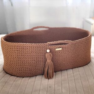 Kosz wykonany jest ręcznie ze sznurka bawełnianego. Miękkie wygodne pierwsze łóżeczko dla noworodka. Dzięki niewielkim wymiarom kosz Mojżesza może towarzyszyć rodzicom w każdym pokoju. Bawełniany sznurek z którego wypleciony jest kosz jest miękki, delikatny, a równocześnie bardzo stabilny. Ścieg szydełkowy wykorzystany w koszu jest lekko ażurowy, dzięki czemu zapewniona jest odpowiednia cyrkulacja powietrza. Dzięki uchwytom kosz Mojżesza można w łatwy sposób przenosić i mieć malucha zawsze blisko siebie.