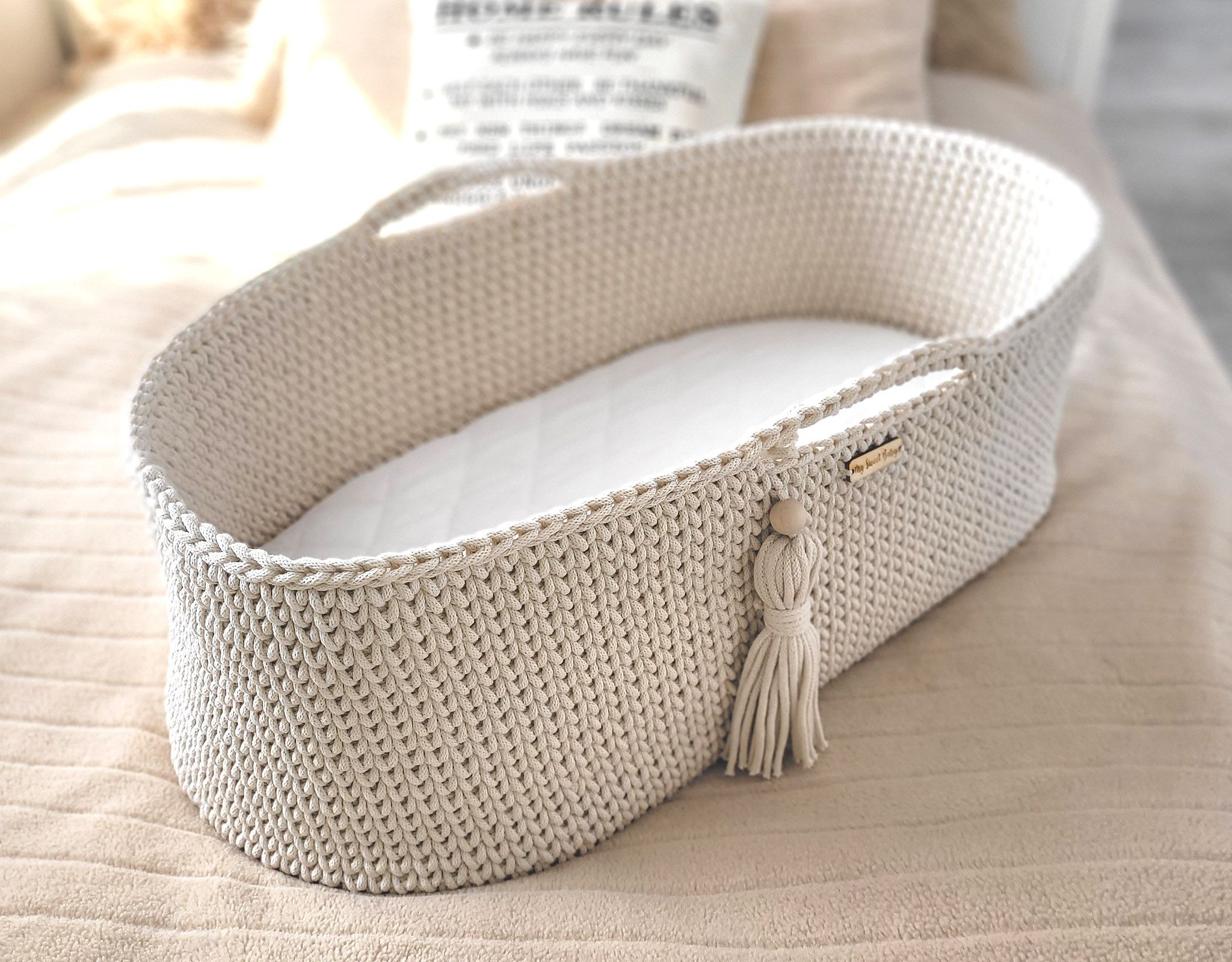 Kosz wykonany jest ręcznie ze sznurka bawełnianego. Miękkie wygodne pierwsze łóżeczko dla noworodka. Dzięki niewielkim wymiarom kosz Mojżesza może towarzyszyć rodzicom w każdym pokoju. Bawełniany sznurek z którego wypleciony jest kosz jest miękki, delikatny, a równocześnie bardzo stabilny. Ścieg szydełkowy wykorzystany w koszu jest lekko ażurowy, dzięki czemu zapewniona jest odpowiednia cyrkulacja powietrza. Dzięki uchwytom kosz Mojżesza można w łatwy sposób przenosić i mieć malucha zawsze blisko siebie.