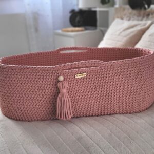 Kosz wykonany jest ręcznie ze sznurka bawełnianego. Miękkie wygodne pierwsze łóżeczko dla noworodka. Dzięki niewielkim wymiarom kosz Mojżesza może towarzyszyć rodzicom w każdym pokoju. Bawełniany sznurek z którego wypleciony jest kosz jest miękki, delikatny, a równocześnie bardzo stabilny. Ścieg szydełkowy wykorzystany w koszu jest lekko ażurowy, dzięki czemu zapewniona jest odpowiednia cyrkulacja powietrza. Dzięki uchwytom kosz Mojżesza można w łatwy sposób przenosić i mieć malucha zawsze blisko siebie.