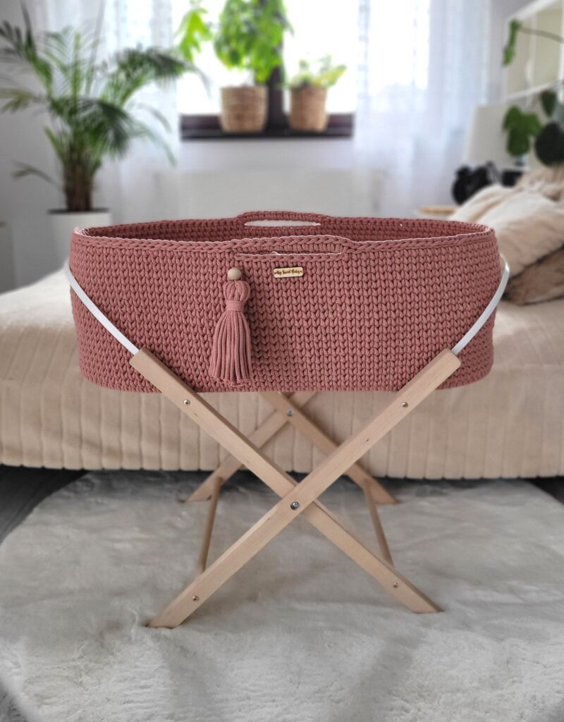 Kosz wykonany jest ręcznie ze sznurka bawełnianego. Miękkie wygodne pierwsze łóżeczko dla noworodka. Dzięki niewielkim wymiarom kosz Mojżesza może towarzyszyć rodzicom w każdym pokoju. Bawełniany sznurek z którego wypleciony jest kosz jest miękki, delikatny, a równocześnie bardzo stabilny. Ścieg szydełkowy wykorzystany w koszu jest lekko ażurowy, dzięki czemu zapewniona jest odpowiednia cyrkulacja powietrza. Dzięki uchwytom kosz Mojżesza można w łatwy sposób przenosić i mieć malucha zawsze blisko siebie.