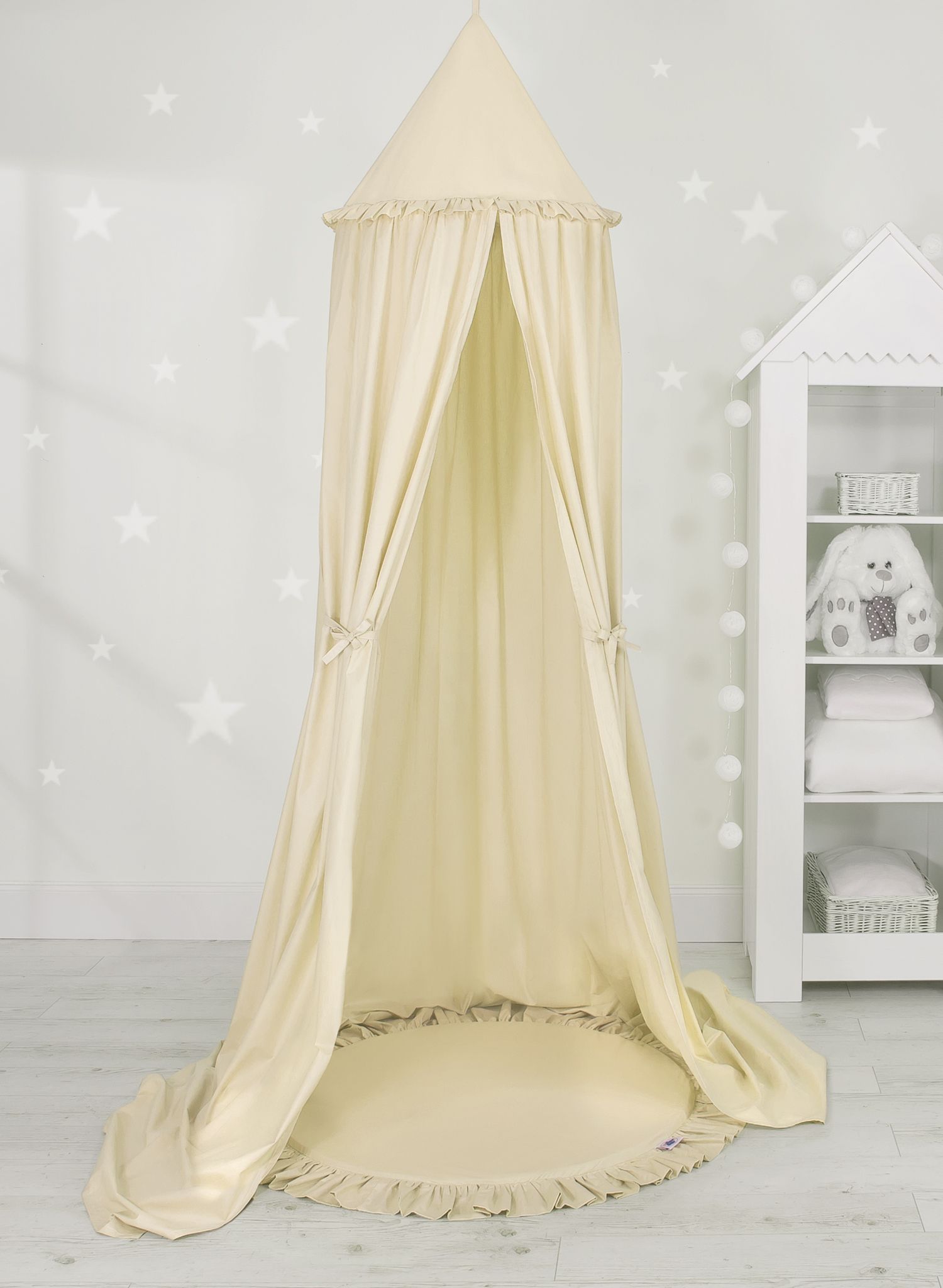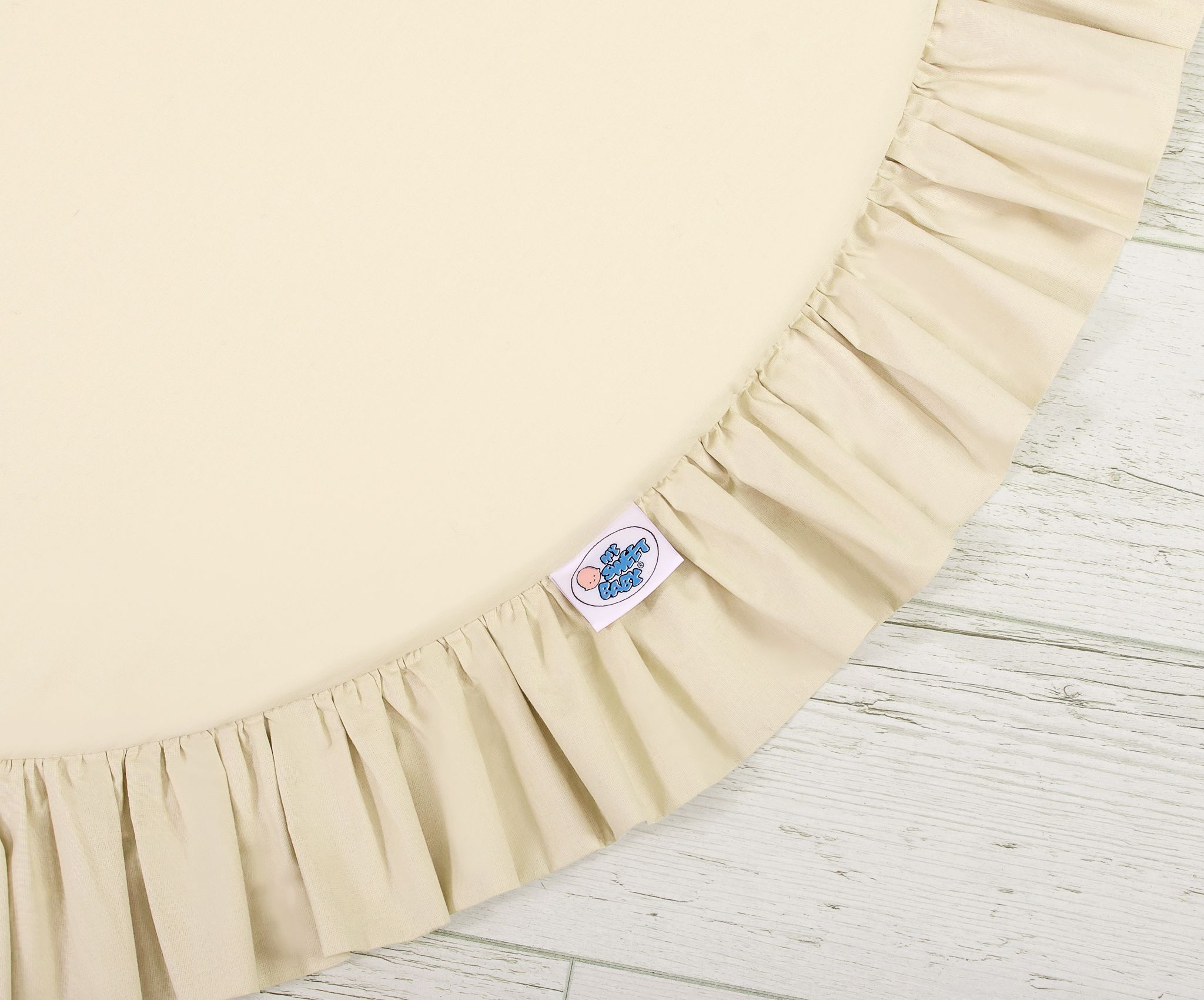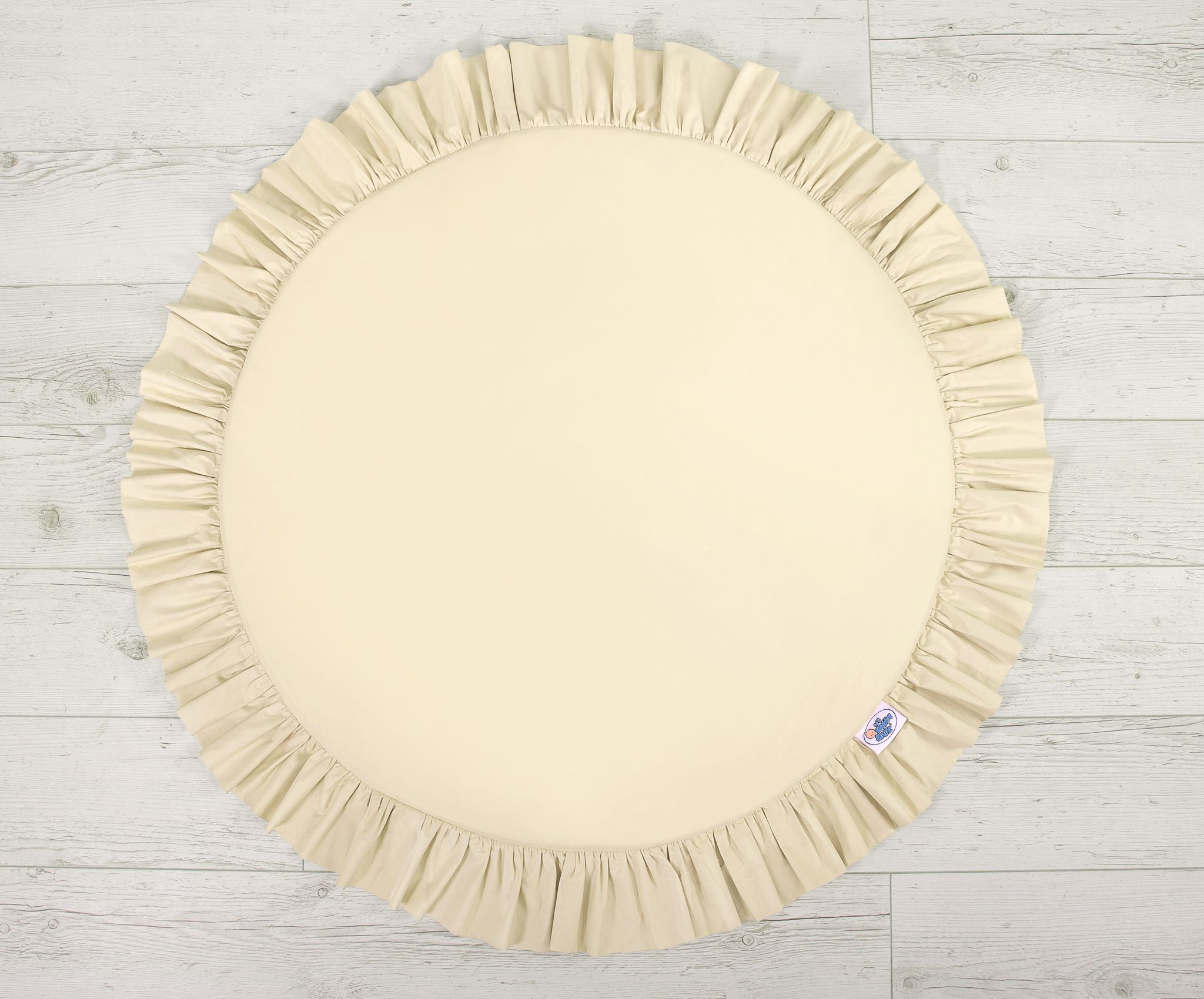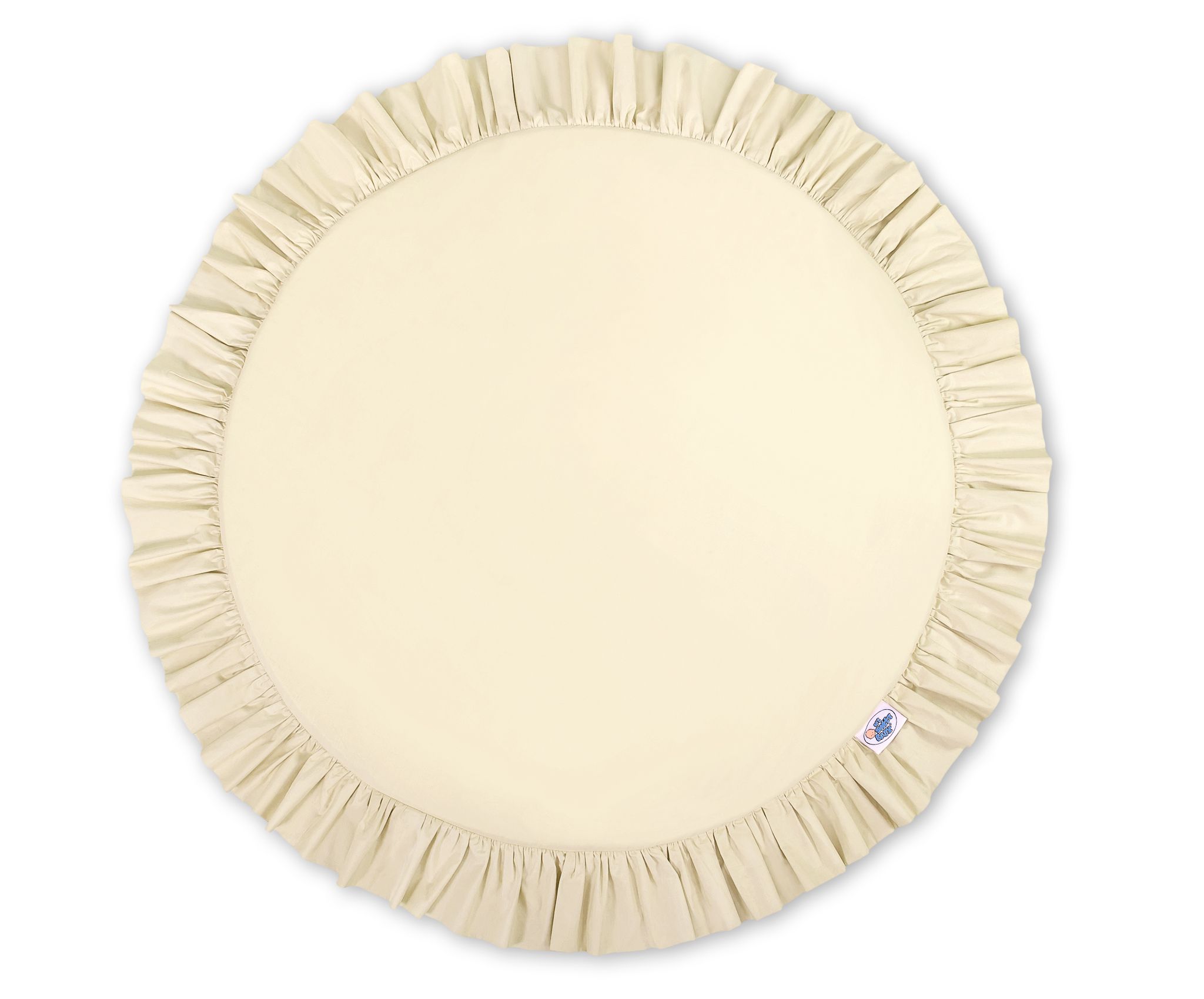 Okrągła mata z falbanką. Funkcjonalna i praktyczna. Doskonale sprawdzi się jako dywanik, mata do zabawy lub „podłoga” baldachimu. Już od pierwszych dni życia może służyć jako mata do leżenia na brzuszku. Posiada miękkie wypełnienie, które świetnie izoluje od twardej i zimnej podłogi. Okrągła mata to również świetne miejsce do zabawy i odpoczynku. Wykonana z tkaniny 100% bawełnianej, posiadającej atest Okotex. Mata jest rozbieralna, dzięki czemu łatwo wyprać sam pokrowiec. Wkładka maty wykonana jest z nowoczesnego antyalergicznego atestowanego surowca.