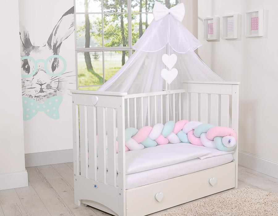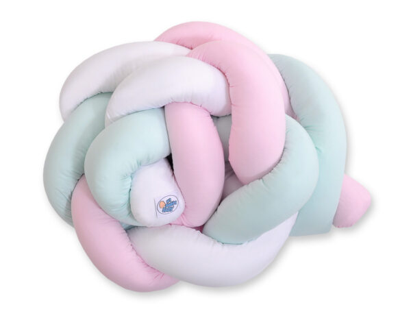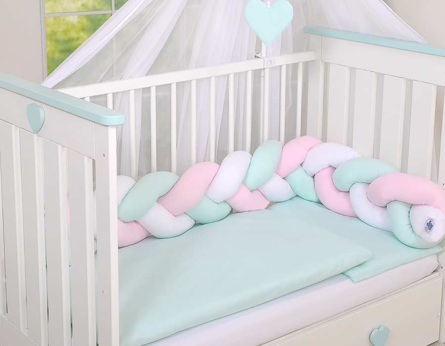 Ochraniacz warkocz pleciony do łóżeczka – biało- różowo-miętowy