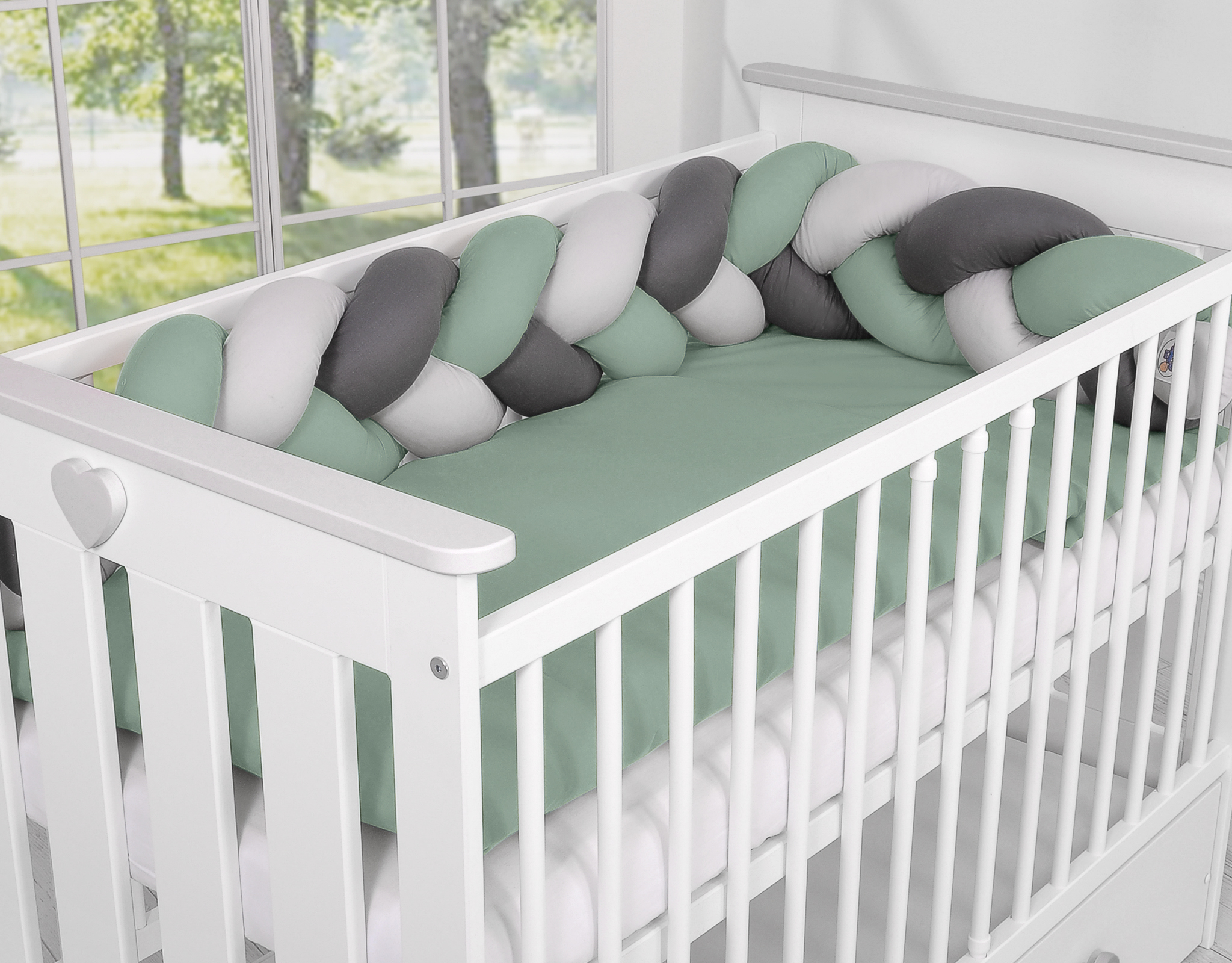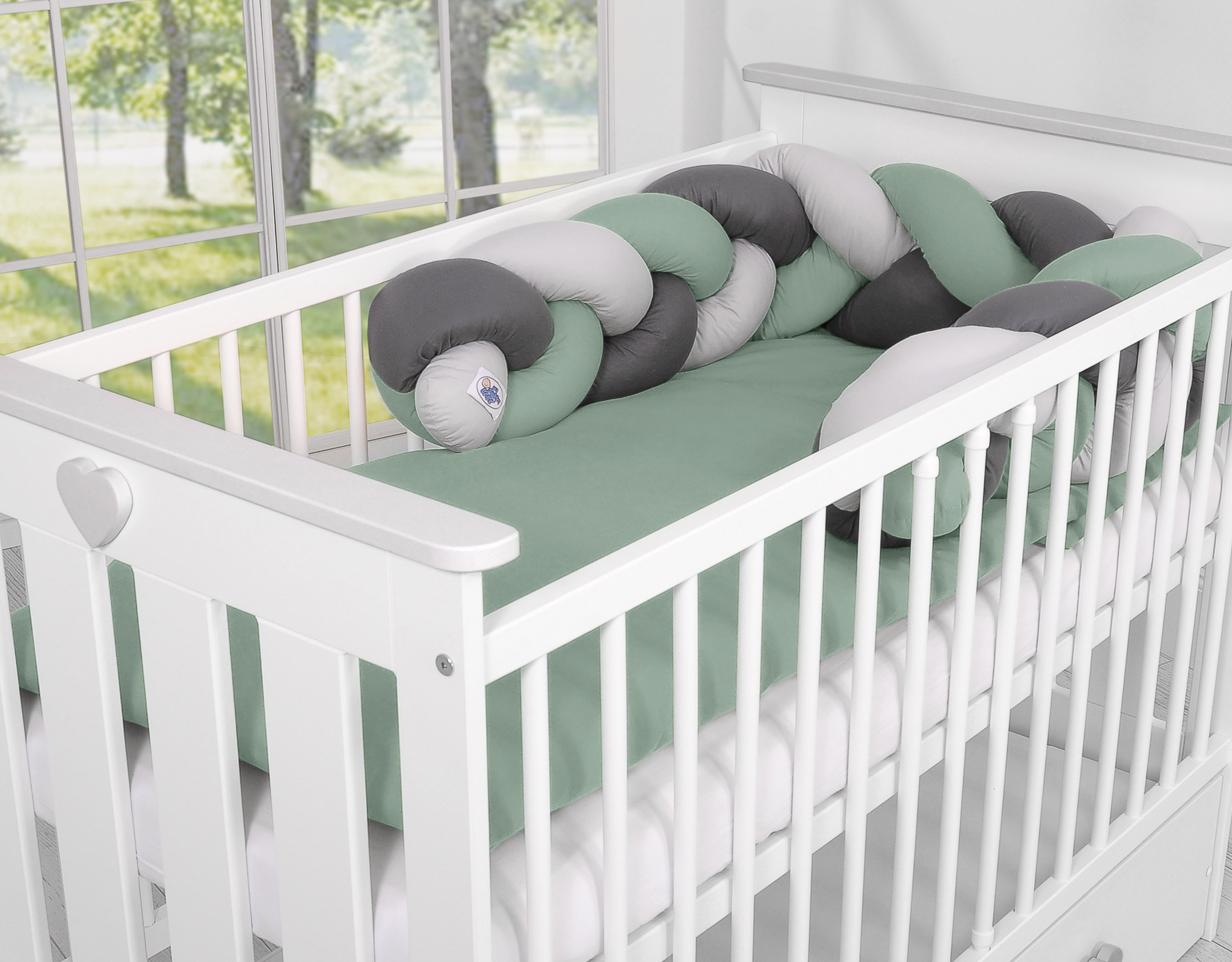 Ochraniacz warkocz pleciony do łóżeczka – szałwia-szary-antracyt