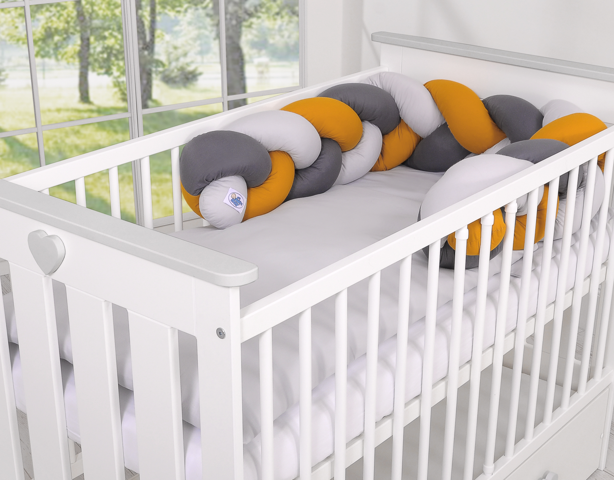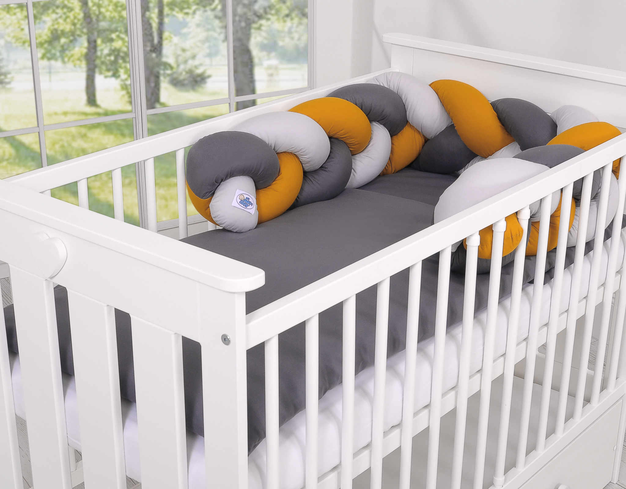 Ochraniacz warkocz pleciony do łóżeczka – szary-musztardowy-antracyt