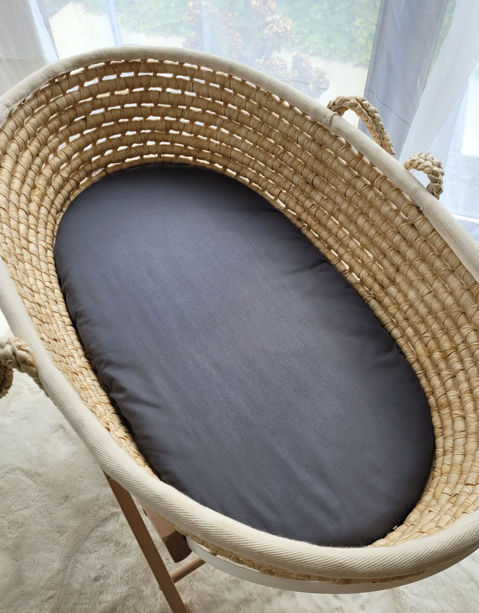 Prześcieradło bawełniane pasuje do koszy Mojżesza Boho, do koszy Mojżesza z łuski kukurydzianej, a także do większości materacyków do wózków głębokich gondoli. Sugerowany rozmiar materacyka: 75×35 cm, grubość 3 cm.