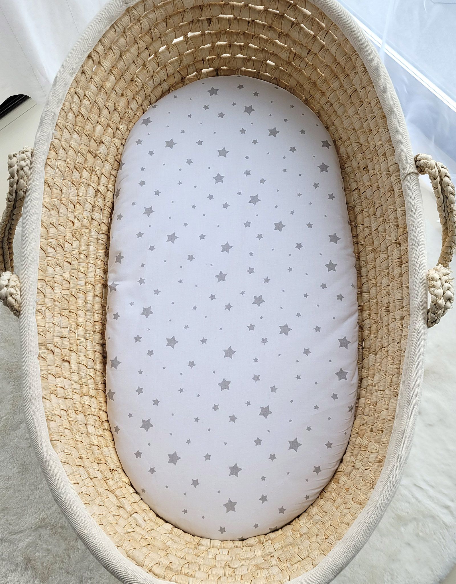 Prześcieradło bawełniane do kosza Mojżesza Boho wózka gondoli 75×35 cm – Mini gwiazdki szare