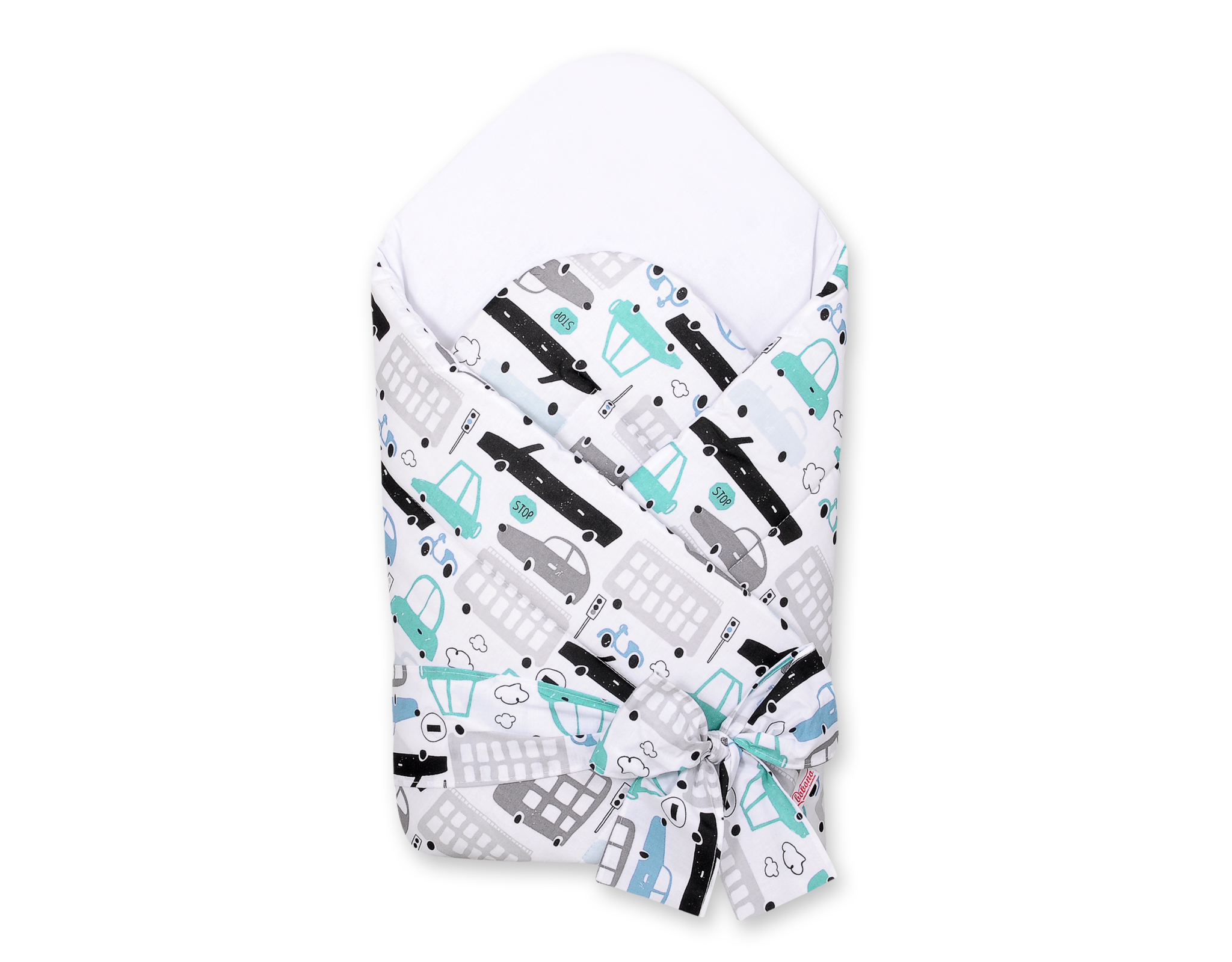 Rożek dla niemowląt usztywniany z wiązaniem – autka szaro-turkusowe