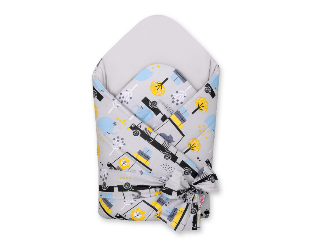 Rożek dla niemowląt z wiązaniem 2w1 usztywniany i miękki – zwierzątka w autkach szare