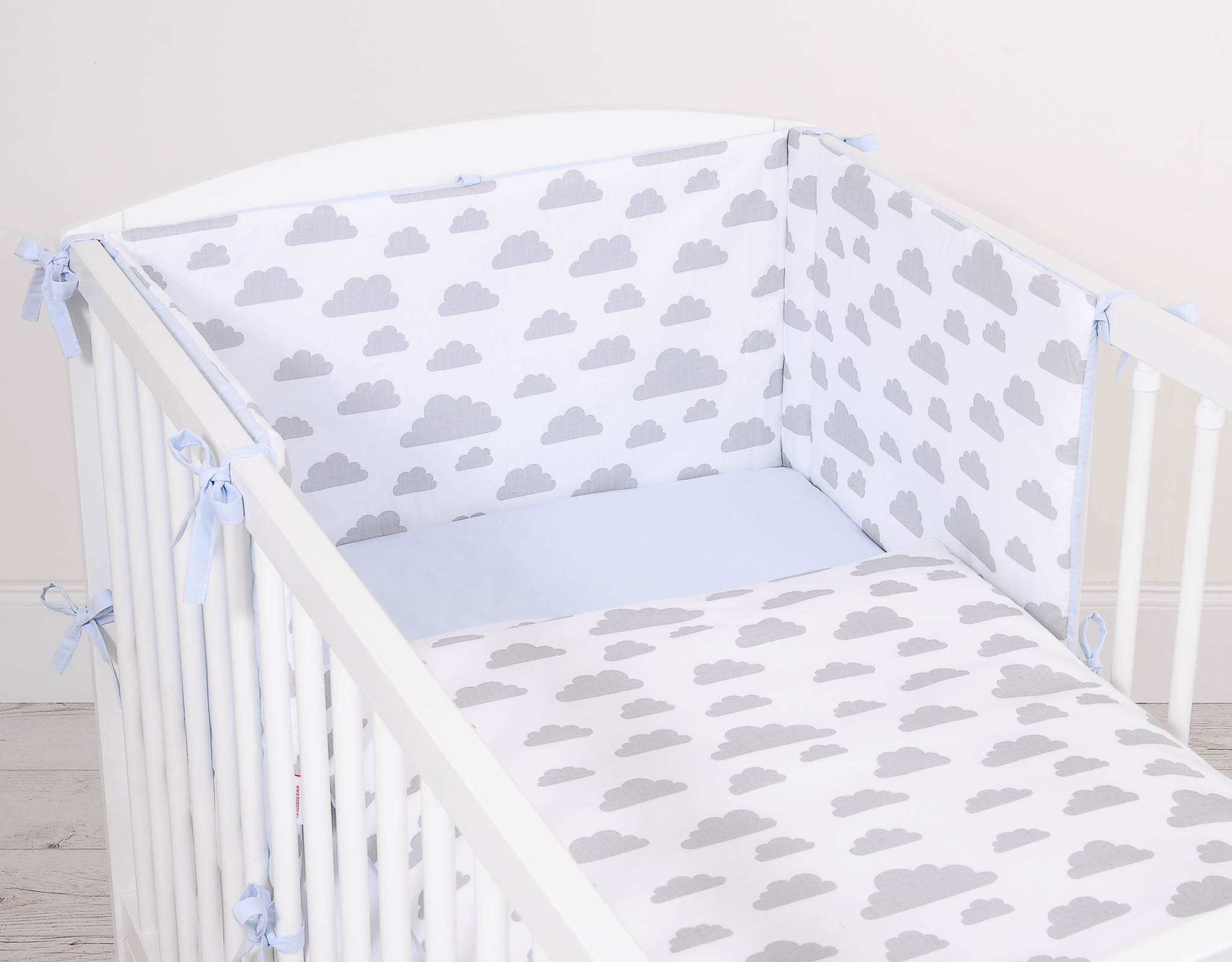 Uniwersalny dwustronny ochraniacz do łóżeczka – chmurki szare/niebieski
