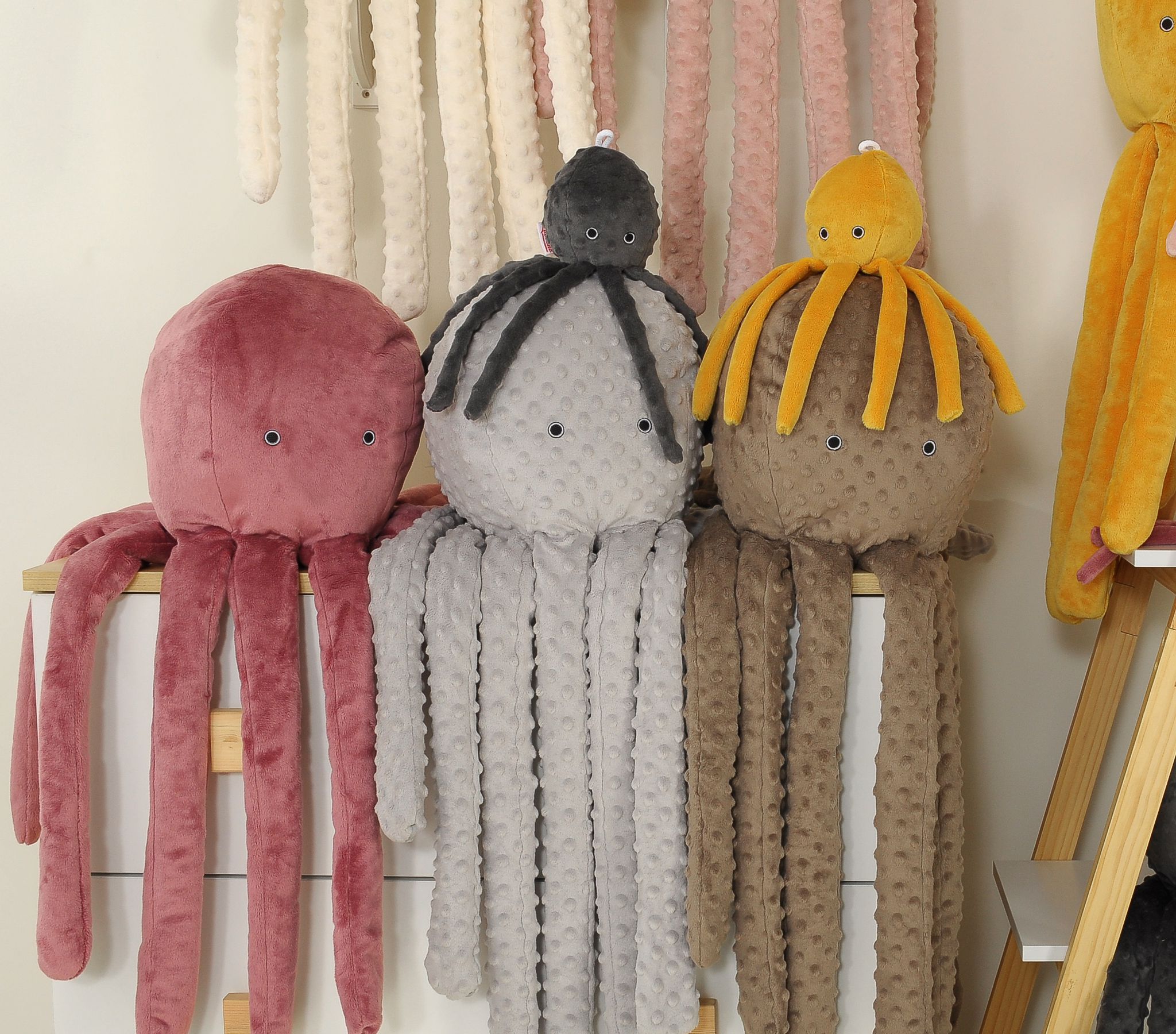Zabawna wielka przytulanka dla dzieci. Idealna do spania i przytulania dla każdego dużego i małego. Ramiona ośmiornicy są długie i efektowne. Ośmiornica może służyć jako poduszka, oparcie i siedzisko. Wielka ośmiornica jest też ciekawą ozdobą pokoju dziecięcego. Miękkość przytulanki zachęca do miętoszenia i przytulania. Ośmiornica uszyta jest z minky w kropki. Wypukłe kropeczki wyglądają na ośmiornicy świetnie!