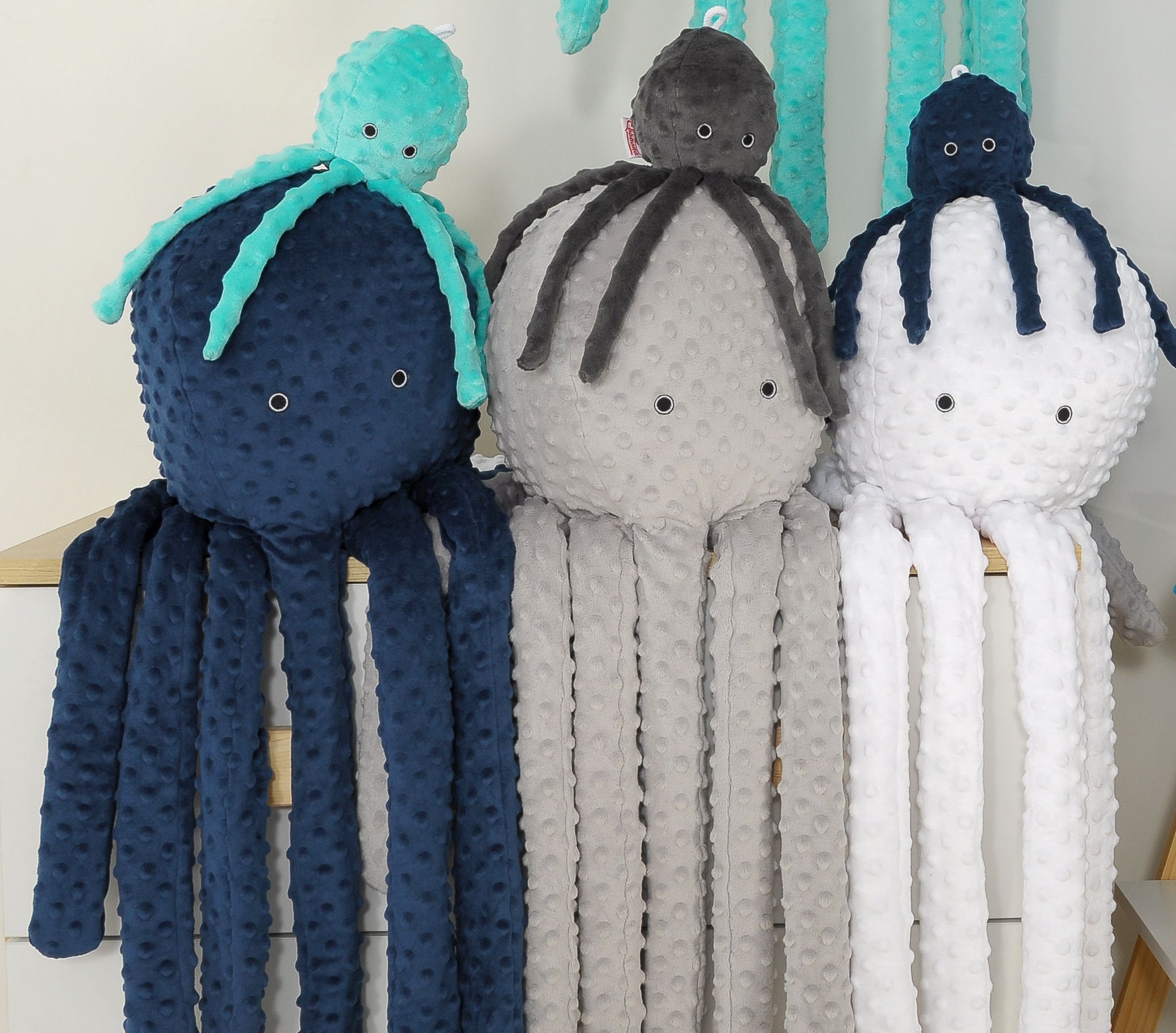 Zabawna wielka przytulanka dla dzieci. Idealna do spania i przytulania dla każdego dużego i małego. Ramiona ośmiornicy są długie i efektowne. Ośmiornica może służyć jako poduszka, oparcie i siedzisko. Wielka ośmiornica jest też ciekawą ozdobą pokoju dziecięcego. Miękkość przytulanki zachęca do miętoszenia i przytulania. Ośmiornica uszyta jest z minky w kropki. Wypukłe kropeczki wyglądają na ośmiornicy świetnie!
